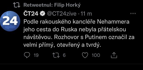 Podle rakouského kancléře Nehammera jeho cesta do Ruska nebyla přátelskou návštěvou. Rozhovor s Putinem označil za velmi přímý, otevřený a tvrdý.