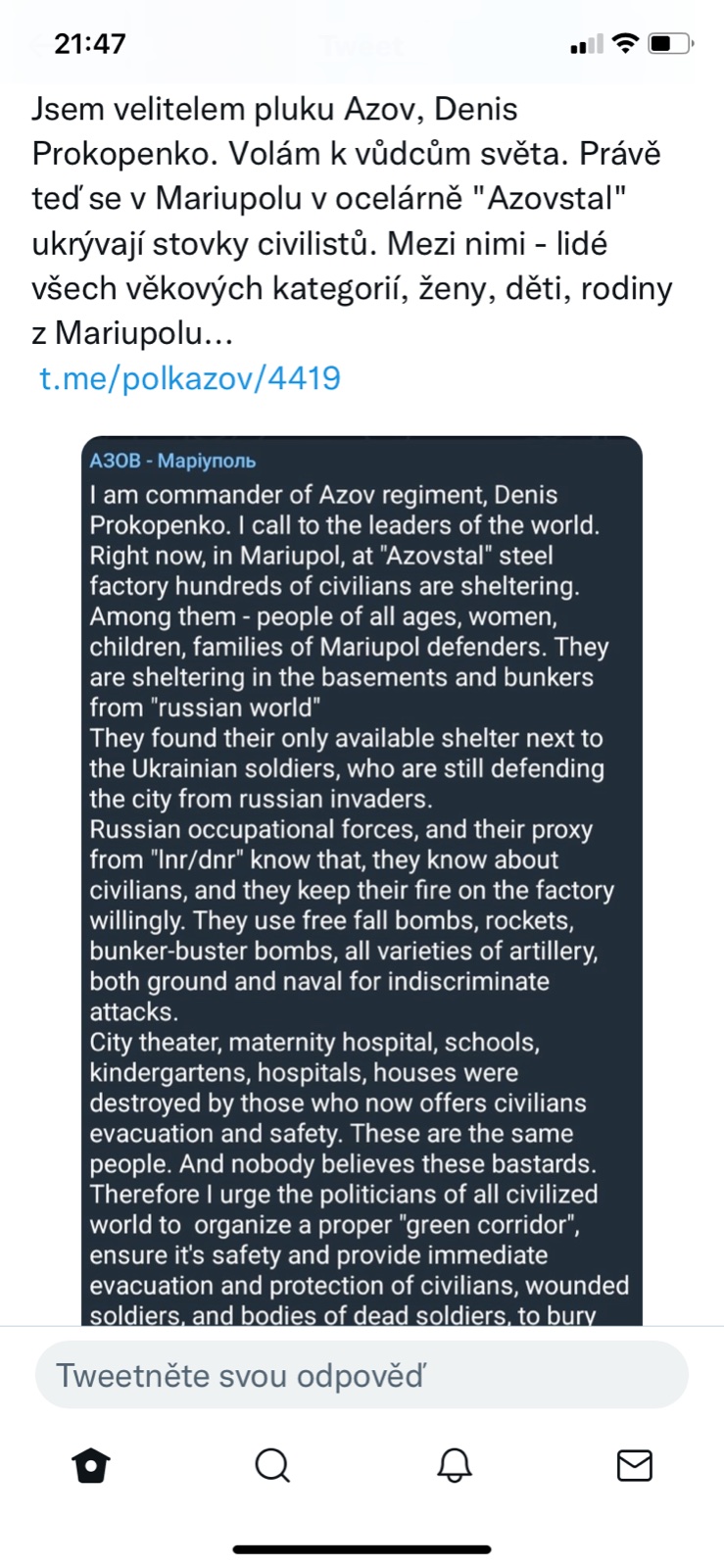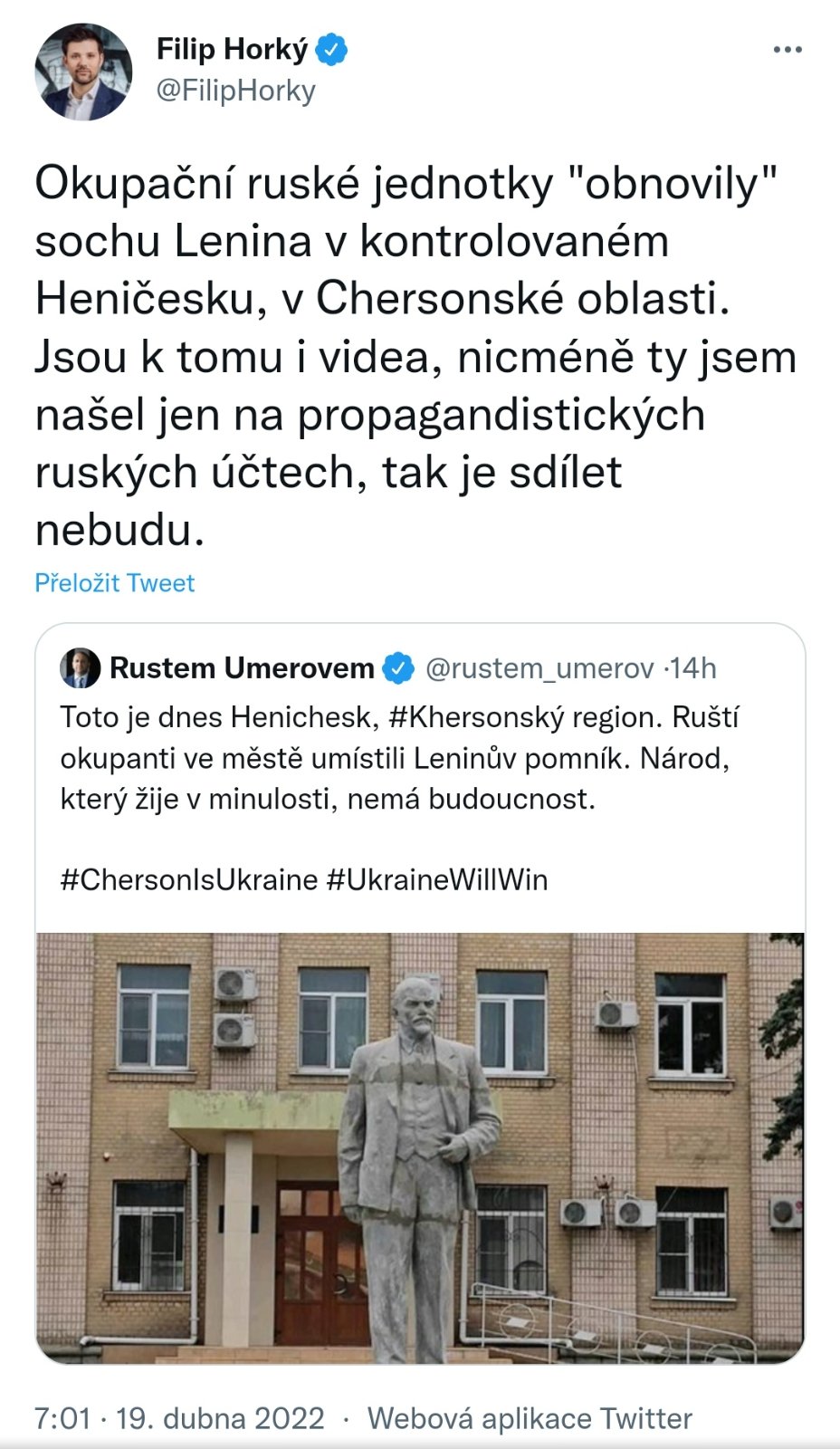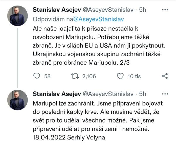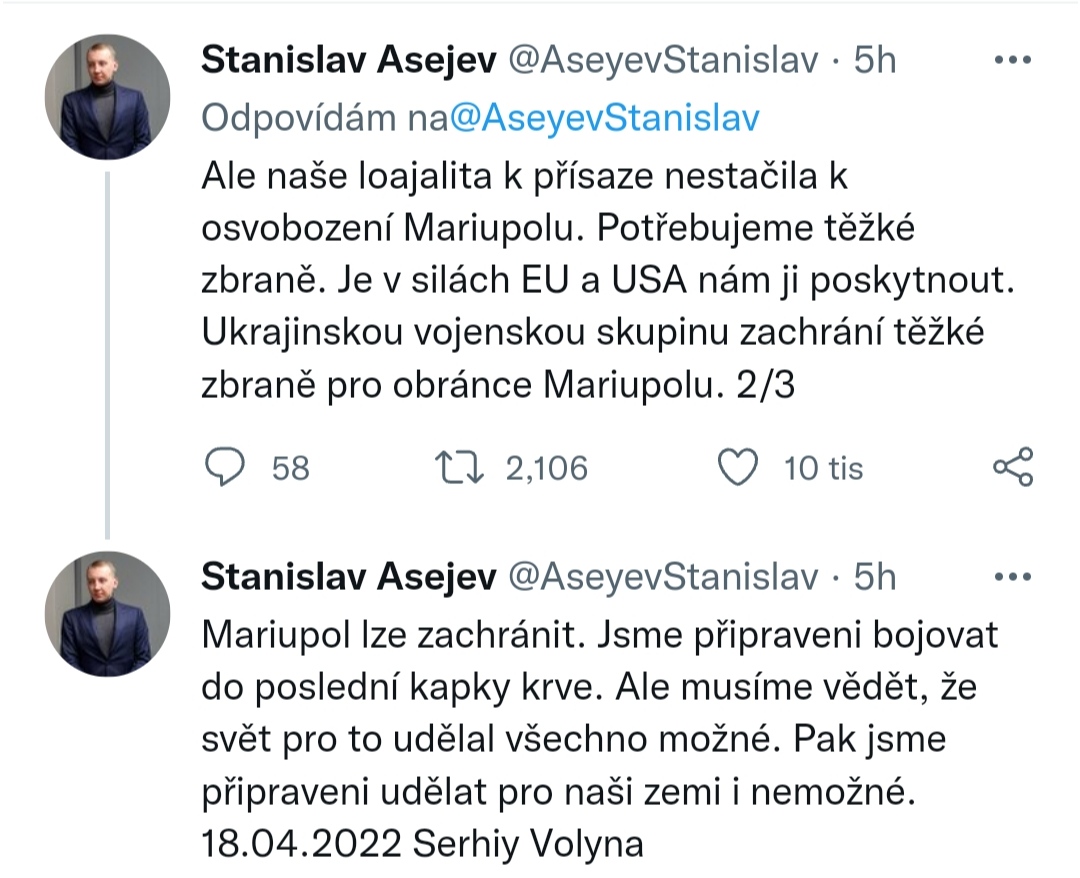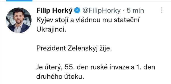 Filip Horký, twitter: Ukrajinci tvrdí, že i na základě odposlechnutých konverzací ruských vojáků mají informace o tom, že některé z okupačních jednotek u Mikolajivu mají až 70% ztráty.