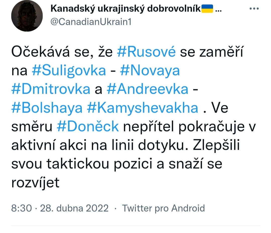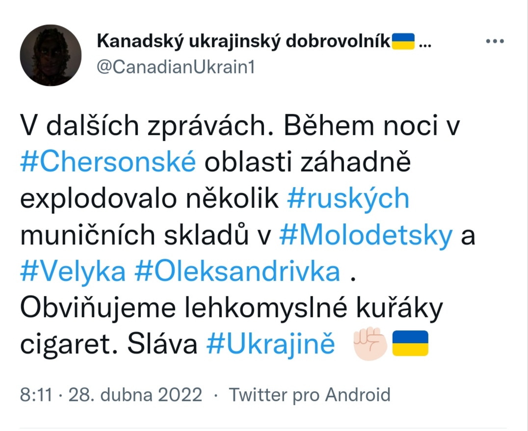 Ukrajinské letectvo: zničeno 8 ruských vzdušných cílů. Tiskové středisko ukrajinského letectva oznámilo počátkem 28. dubna, že Rusko za posledních 24 hodin ztratilo nejméně jedno letadlo, jednu střelu a 6 UAV.