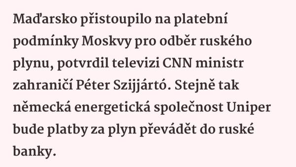 Lukáš Kovanda: .rublový účet u Gazprombanky si otevře i italský energetický obr Eni. Takže se v tom nakonec vymáchá asi jen Polsko a Bulharsko. Některé státy EU si navíc stěžují na nejasná vodítka Evropské komise stran toho, co vlastně mají dělat. Chaos a nejednota. Tak to mají v Kremlu rádi.