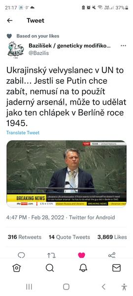 @elencze Tohle uz je obrovska, nezastavitelna lavina a Rusko to vi. A taky vi, ze pokud Putin prezije, nepreziji oni. Je to otazka casu. Putin vypsal odmenu sam na svoji hlavu, debil jeden. A tim vyhrozovanim atomovkou si podrizl vetev. Celej svet vi, ze ted uz nesmi couvnout.