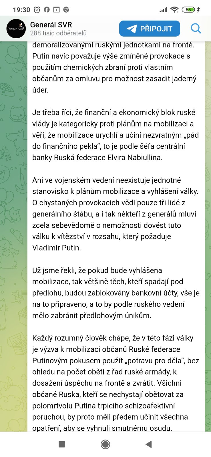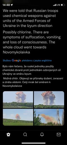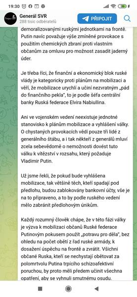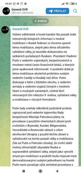 Koukla jsem zase na tajemného generála. V příspěvku že 4.5. se píše: "Zde se Putin a Patrušev shodují, že civilní oběti mohou shromáždit obyvatele Ruska a ospravedlnit vyhlášení války, stejně jako vytvořit smysl pro mobilizaci a podnítit touhu bojovat mezi demoralizovanými ruskými jednotkami na frontě. Putin navíc považuje výše zmíněné provokace s použitím chemických zbraní proti vlastním občanům za omluvu pro možnost zasadit jaderný úder."