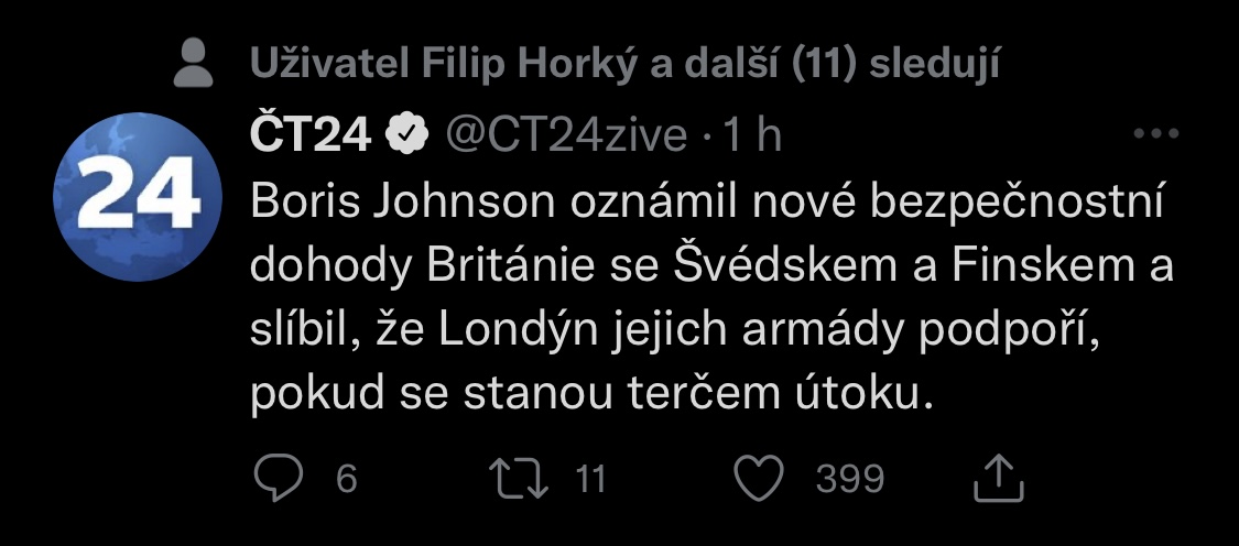 ČT24:Finský prezident Sauli Niinistö a ministerská předsedkyně Sanna Marinová oznámili, že podporují vstup země do Severoatlantické aliance.