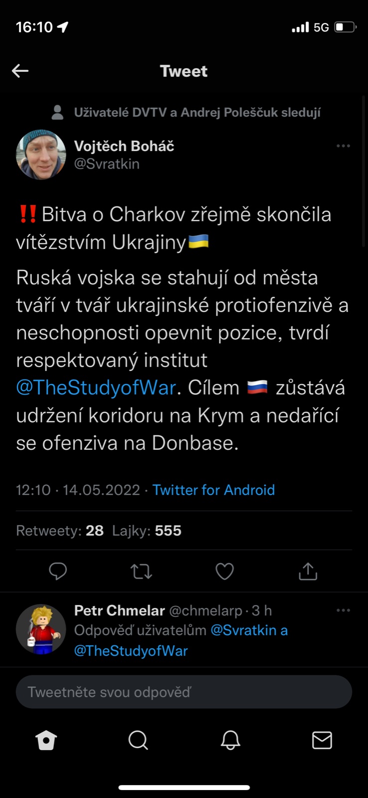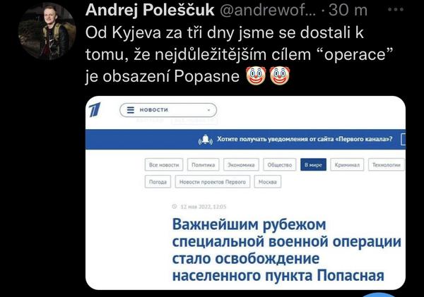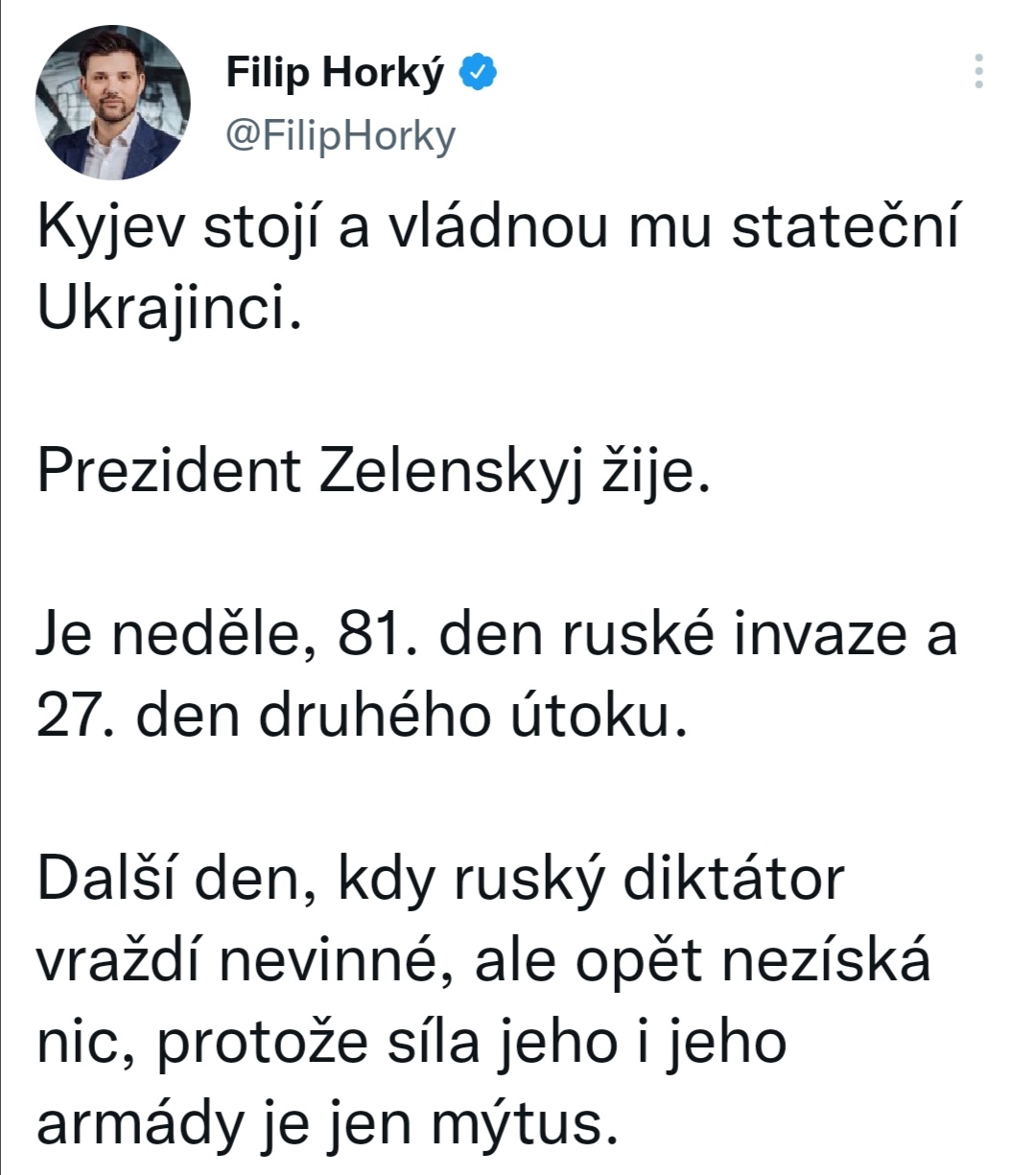 @odula Jistěže je to zjednodušující, ani náhodou nejsem odborník na mezinárodní vztahy, takže je to prostě můj osobní pocit z té situace. A víceméně to nesleduju jinak než tady, pro svoji vlastní psychickou pohodu. S těmi požadavky jsem zaznamenala akorát to, že kdykoliv to začalo vypadat, že by mohli Rusové v něčem ustoupit, přišlo vyjádření od vedení, že trvají na původním návrhu a o tom nebudou diskutovat. Asi máš pravdu se změnou rétoriky, ale to je podle mě pochopitelné - jasně, že bude mluvit jinak, když má nepřítele kolem Kyjeva, a jinak, když osvobozuje území a odněkud je vytlačuje. A ano, jsem naivní, věřím ve spravedlnost, proto bych taky nedělala práva ani politiku, nedokázala bych to. Jasně, že chápu, že bude potřeba dohoda, pokud nemají zničit celý svět, ale pořád je ve mně ta naděje, že nějaký Aragorn vyjede do poslední bitvy a slavně zvítězí 😅 Víceméně to vnímám jako @levandule_k, jen to neumím tak vyargumentovat.