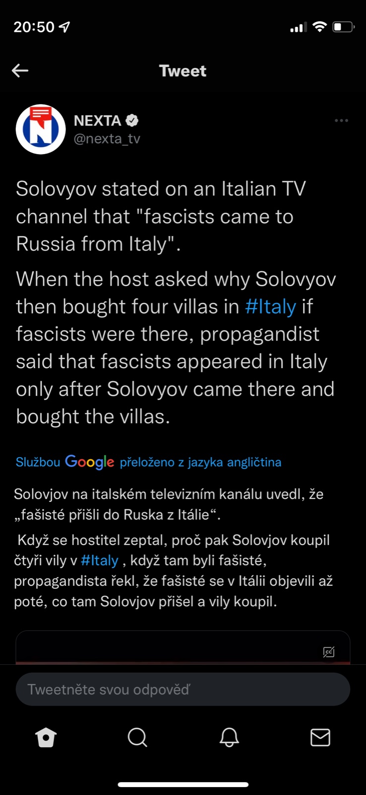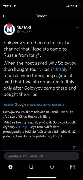 @pampeliska1313 :D no ty vole. Hele vis co? Ja uz jsem si normalne vymyslela vlastni konspiracni teorii. A sice ze Americani vymysleli drogu, ktera zneskodni nepritele tim, ze mu drasticky snizi inteligenci. A deploynuli ji v kremlu/moskve prave, mezi temahle typkama v televizi a v putinove okruhu. Dobre, solovyov je debil, tak u nej ten pokles neni tak markantni. Ale nedovedu si nijak jinak vysvetlit treba Lavrovova vystoupeni nebo zvasty zacharovovy o borsci. Vsichni zblbli.