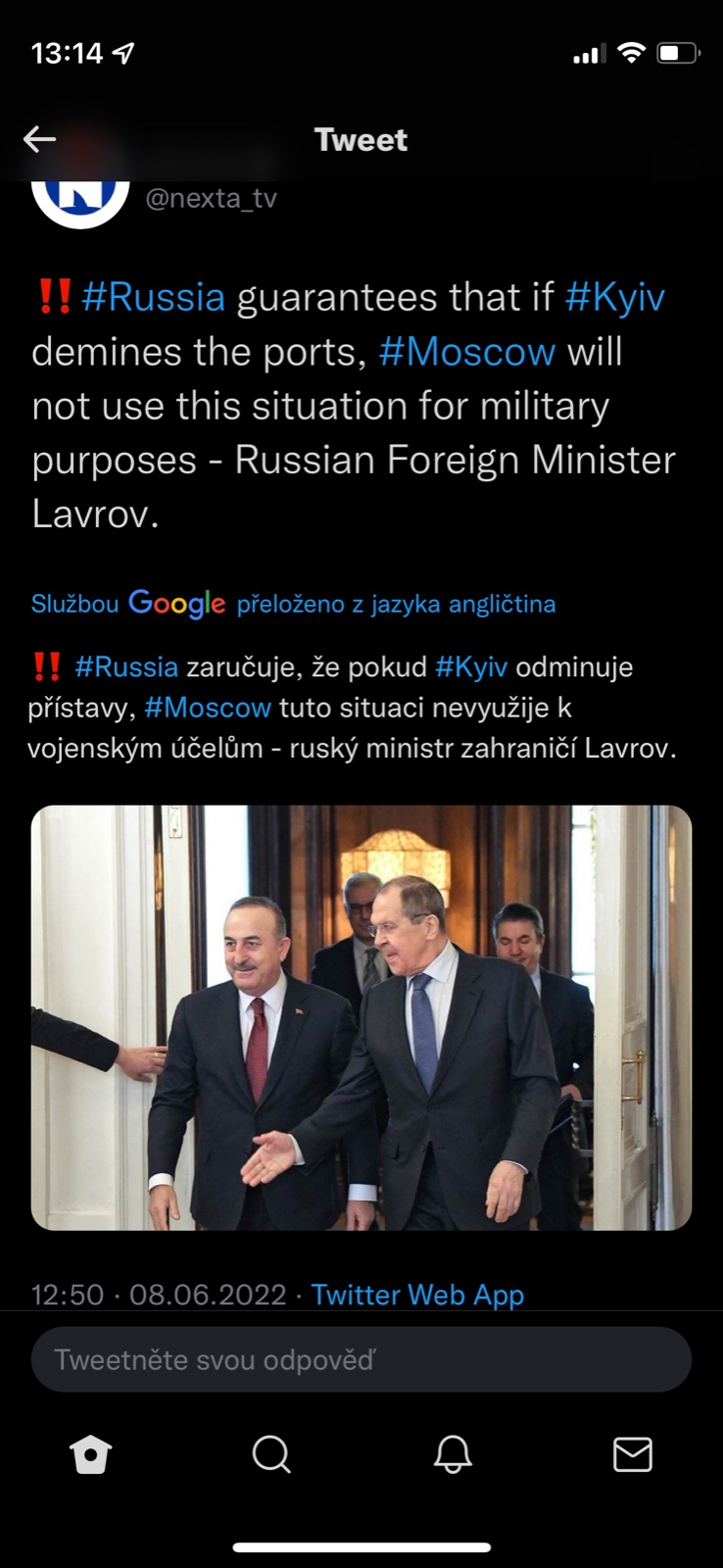 Lavrov poněkud podrážděně prohlásil, že Zelenskij by měl dát příkaz k uvolnění ukrajinského obilí z oděského přístavu na základě dohody.
