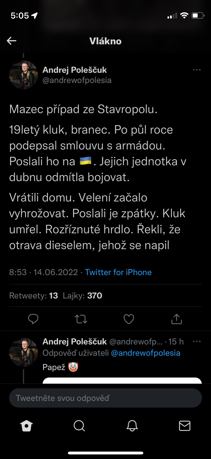 @levandule_k dokud se nedozvim o nějakých zvěrstvech (a porad doufám, ze to nedělají úplně všichni tam) tak na ne koukám jako na lidi, mladý kluky atd. a jo, je mi to lito, i těch matek (doted si vybavuju ze jedna matka pomoci videa se zajatcema poznala svyho syna a když se ji na nej ptal někdo, odpověděla “samozřejmě ze mam strach, Vim kde má znamínka, poznala jsem ho, je to moje dítě. Vite, kojila jsem ho.” A pak se třeba na twitteru doctu, ze nejakej jinej mladej kluk se smál, ze Ukrajina už nebude. A lito mi ho není. Protože tam jel s tím, ze bude ubližovat a nebude mu to lito pravděpodobně, minimálně z toho co napsal.. ale koukám na to tak, ze kdyby nebylo války a toho, ze je u nich tohle “povoleny” pravděpodobně bude “jen blbec” ale ne vrah. A jak je hrozny co to v tom člověku probudí. Putin má na svědomí i to, co se z těch kluků stalo/stane a co tam dělají. Ne, jen mrtvý. Ale každou noční můru, každou výčitku toho, kdo se vrátí a připusti si, co se stalo. A ponesou si to všichni, pokud v sobě mají trochu citu (vyjma Putina. Ten má místo jen pro moc)