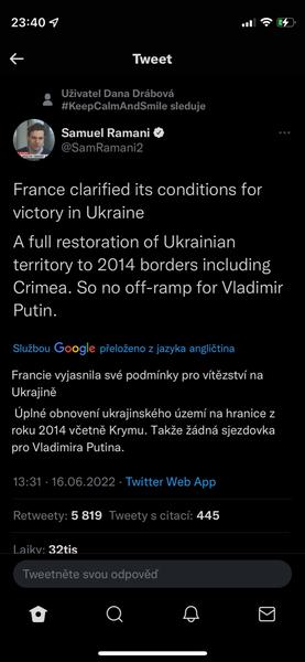 Konečně Macron řekl něco užitečného, teda doufám, že to řekl 🙂 : ČT24Nikdy nebudeme požadovat od Kyjeva ústupky v jeho konfliktu s Ruskem, řekl v Kyjevě francouzský prezident Macron podle agentury Reuters.