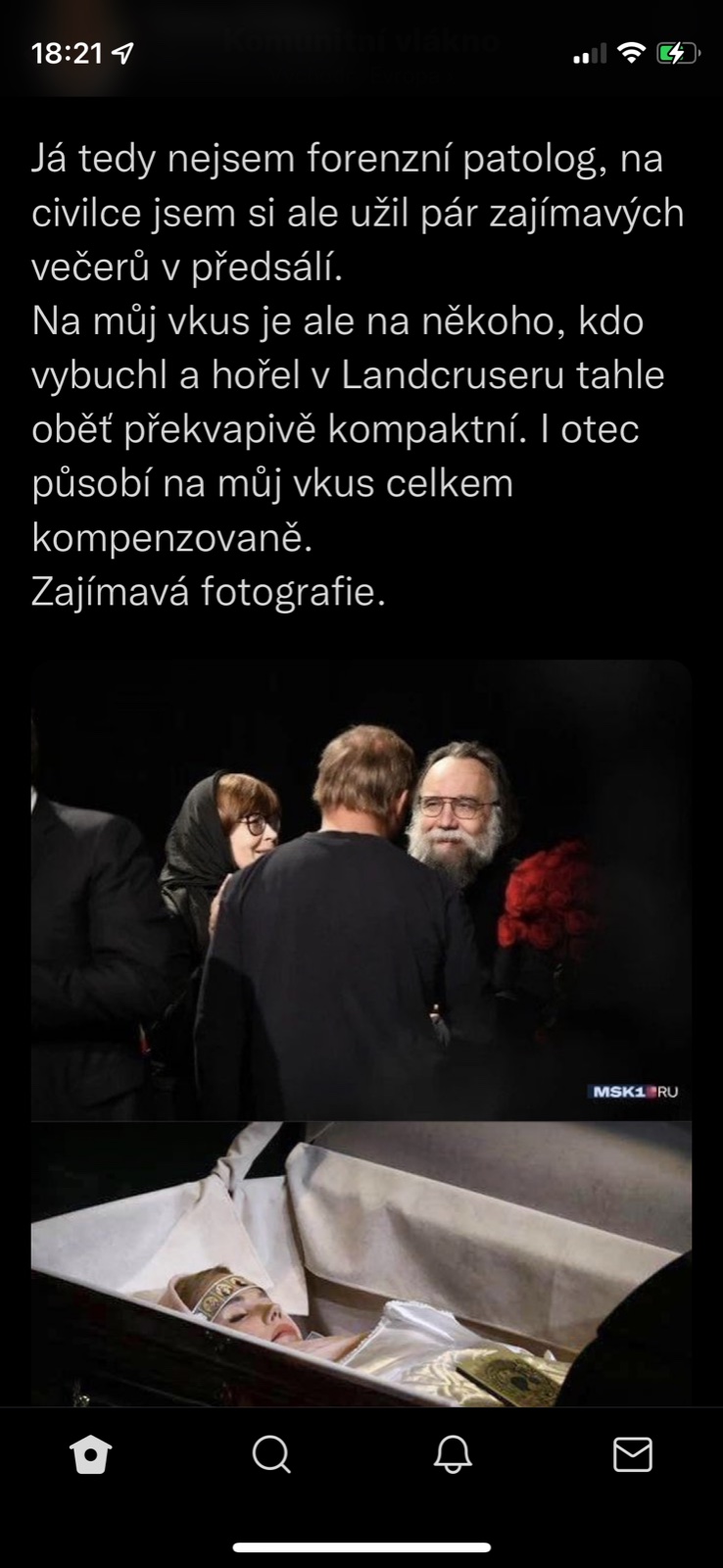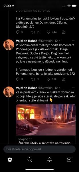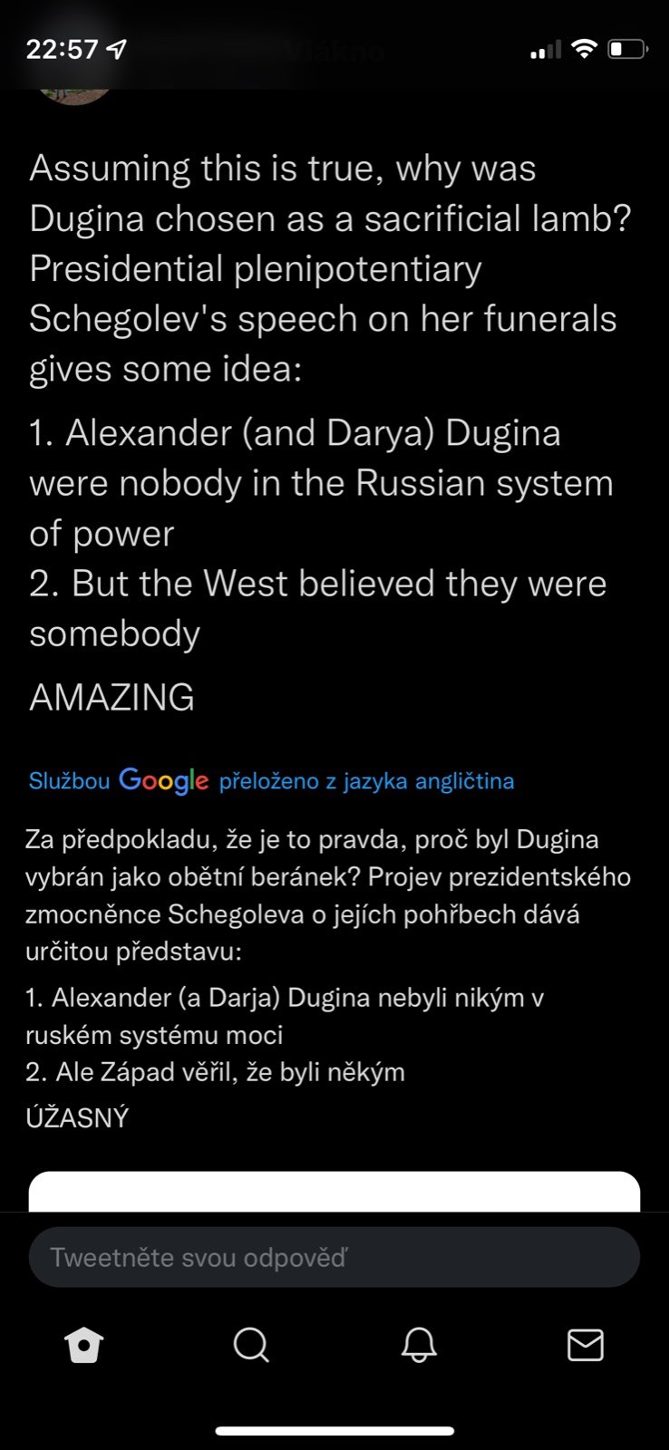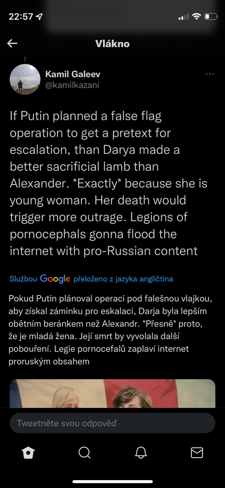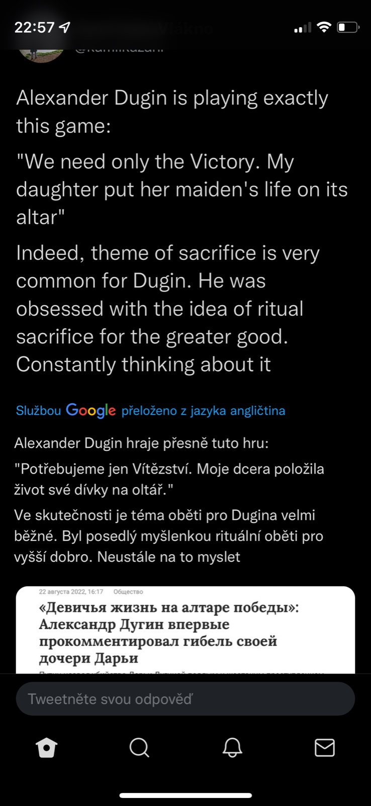 @pampeliska1313 tvl a prvni co me pri tom atentatu napadlo bylo "udelala to FSB aby to pak mohli na nekoho hodit" a dokonce "Dugin o tom byl obeznamen a proto v tom aute nakonec nebyl, jen obetoval dceru pro svoji ideoligii" a stydela jsem se jakej jsem konspiracni teoretik...a podle tohohle prispevku je tohle uvazovani vlastne mainstream 🤣.