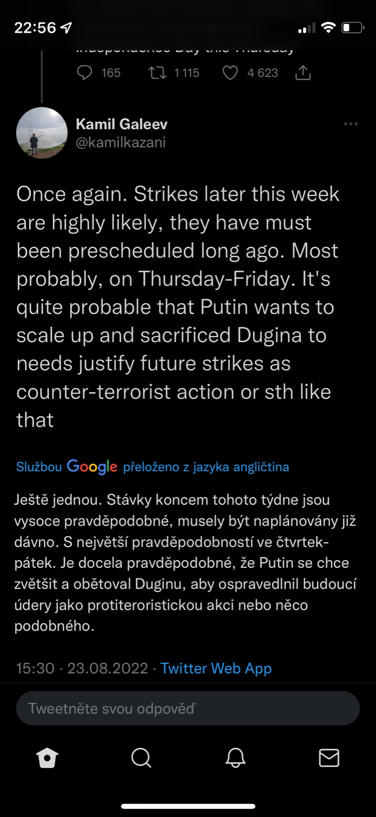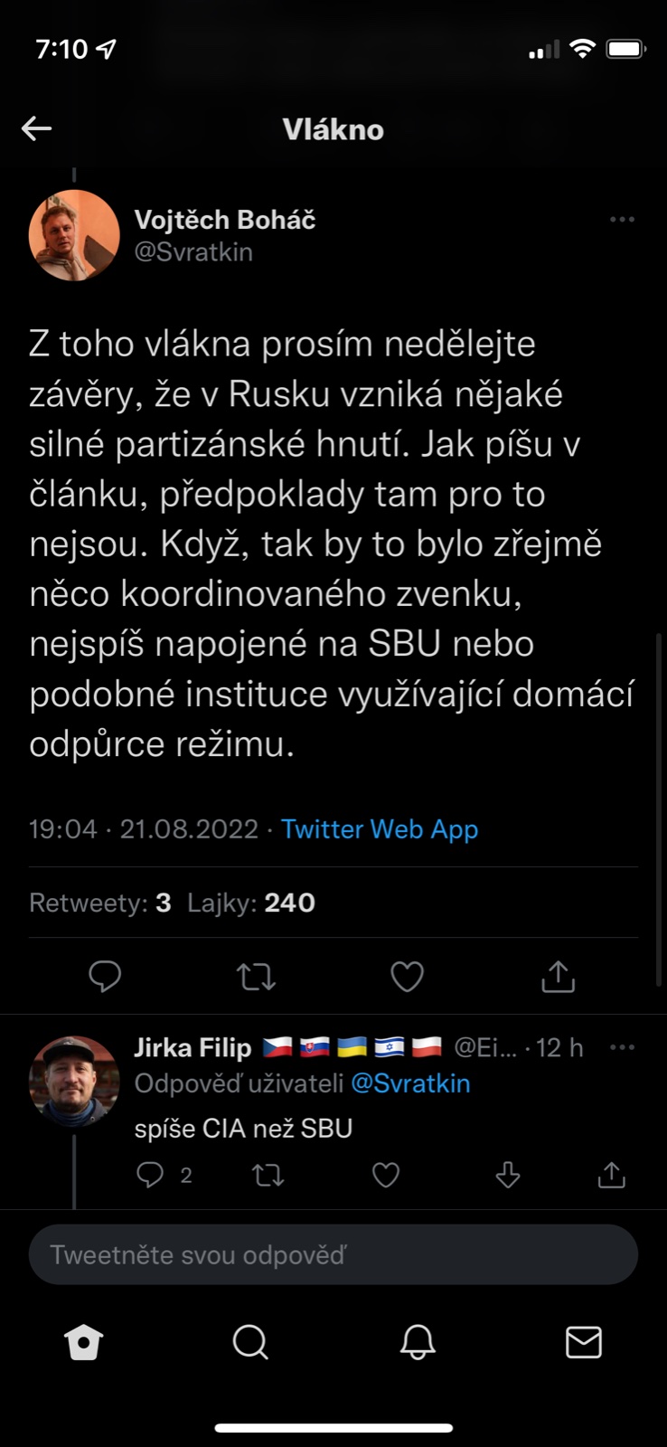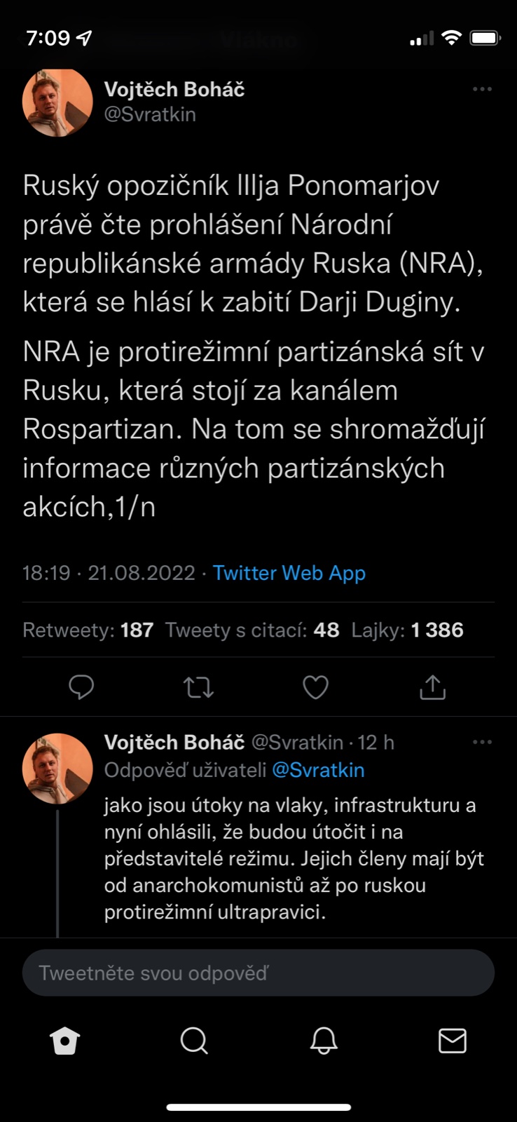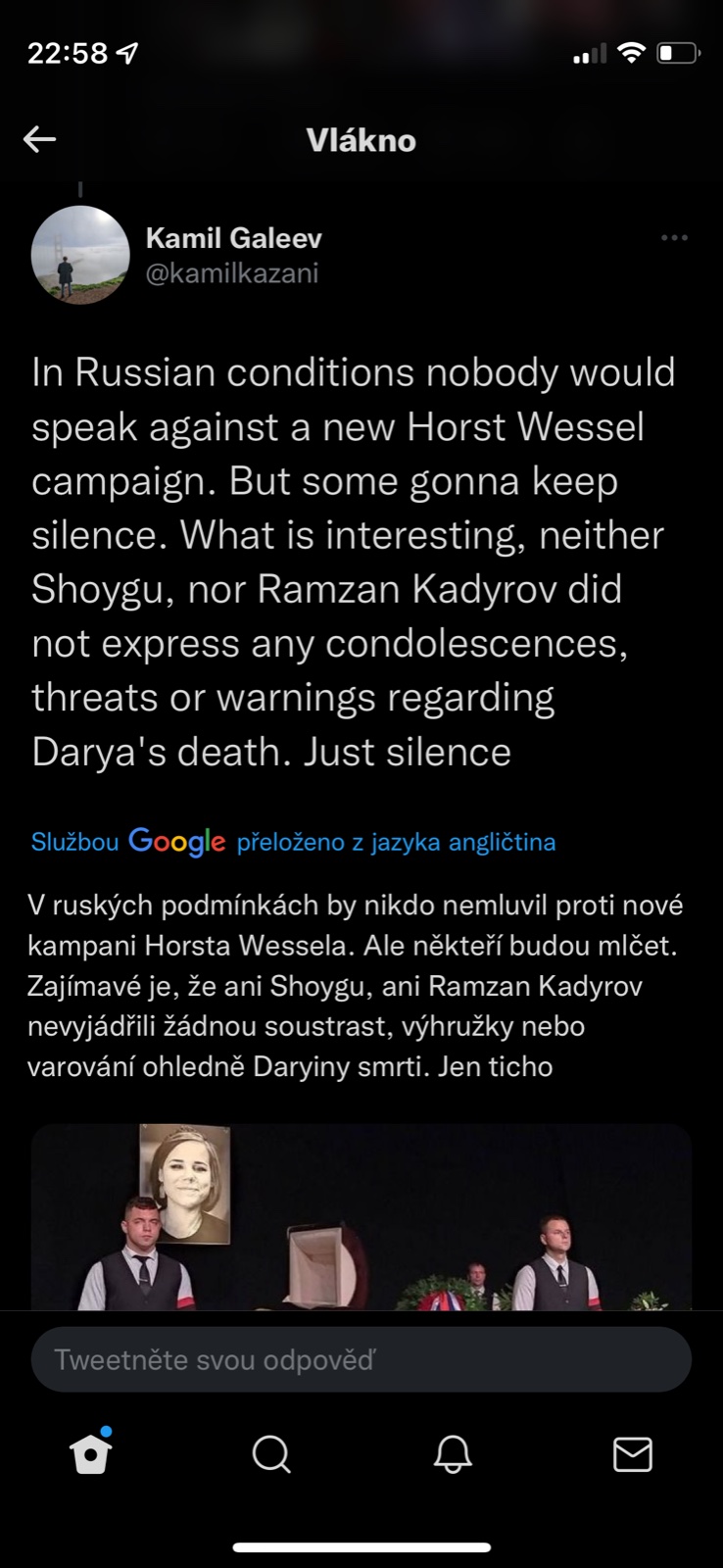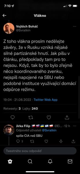 @pampeliska1313 tvl a prvni co me pri tom atentatu napadlo bylo "udelala to FSB aby to pak mohli na nekoho hodit" a dokonce "Dugin o tom byl obeznamen a proto v tom aute nakonec nebyl, jen obetoval dceru pro svoji ideoligii" a stydela jsem se jakej jsem konspiracni teoretik...a podle tohohle prispevku je tohle uvazovani vlastne mainstream 🤣.
