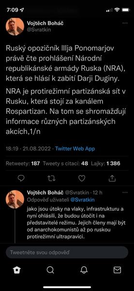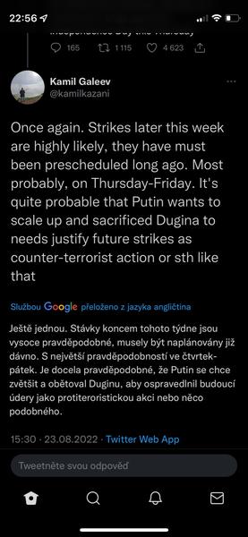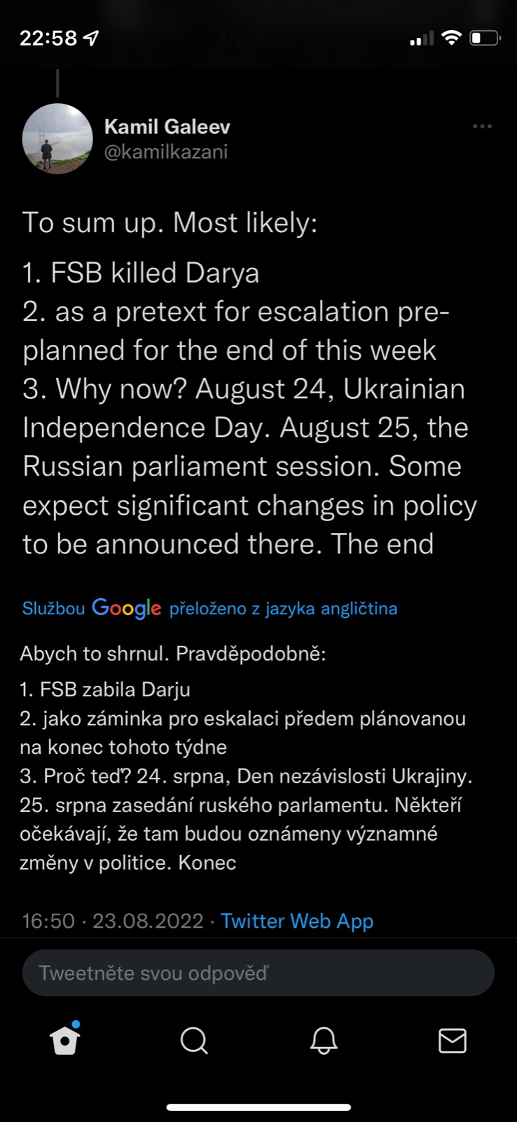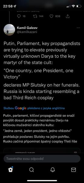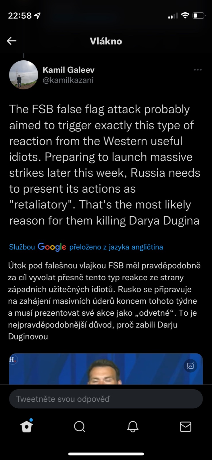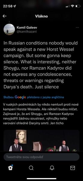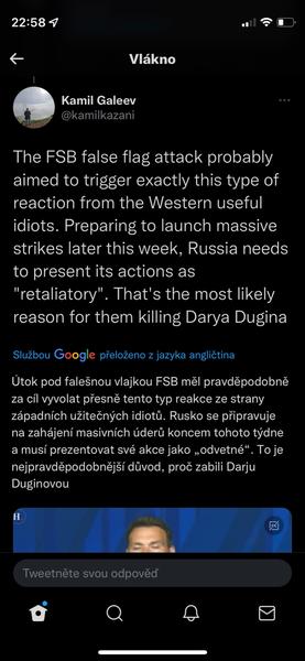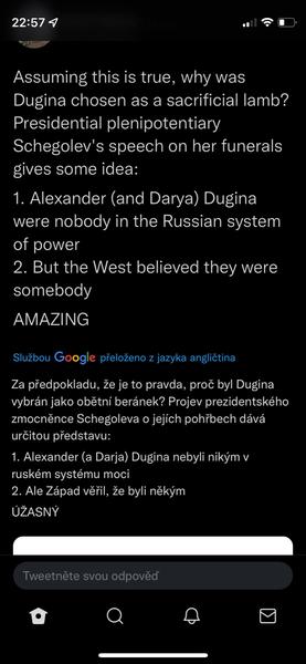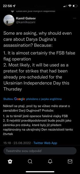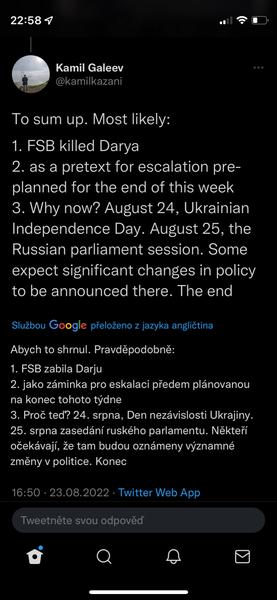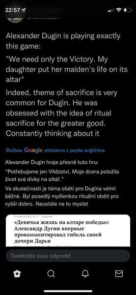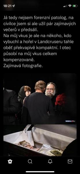 Když jsme u těch konspirací s Duginovou, sdílím názor z twitteru Honza Palička:Vlastne bych se vubec nedivil, kdyby Duginovou nechal odpalit ten jeji vypečenej fotr, aby se zas dostal na vysluni jako otec mucednice a stocil nenavist vuci Ukrajine. Schopen toho je. A vlastne bych se v ruSSku, velmoci lží, vubec nedivil, kdyby ta mrcha vubec nebyla mrtvá.