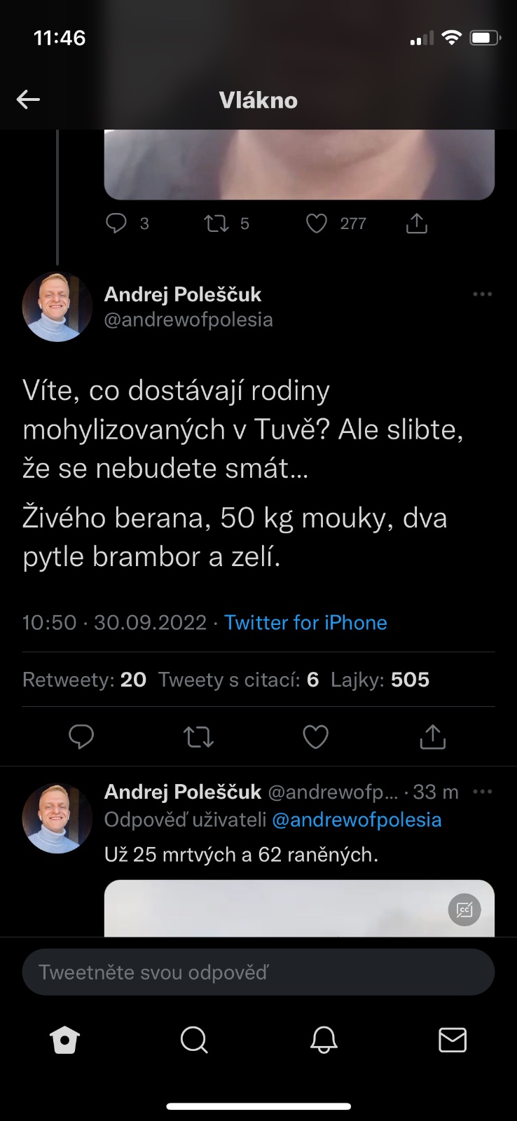 Osobně, nehrající si na ceremonie, jen ve svém obvyklém tričku s UA vlajkou, předává vyznamenání a poděkování příbuzným padlých vojáků. V jeho tváři vidím reálnou bolest a smutek za každého jednoho mrtvého člověka.