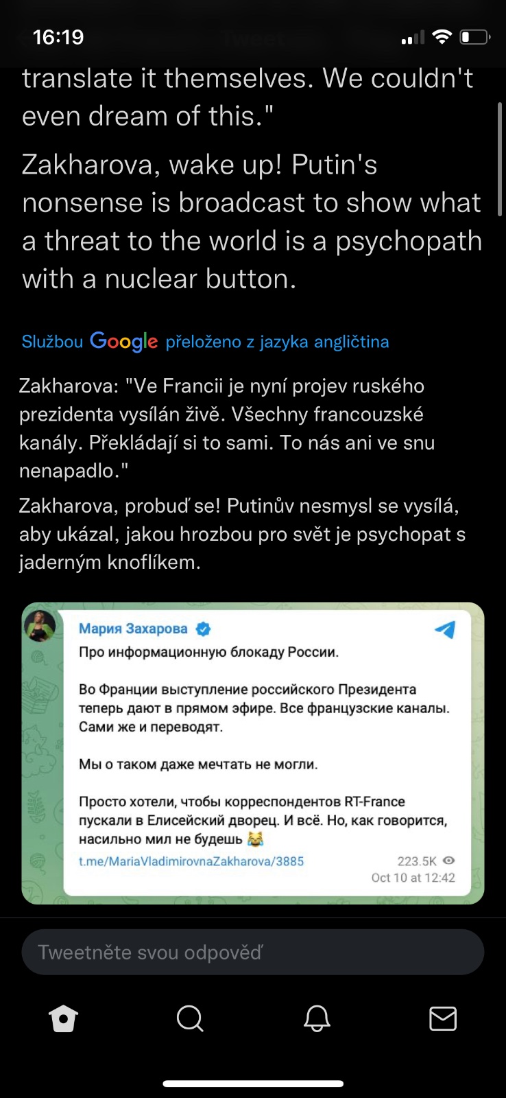 @bramarfi to netuším. Prvně jsem to pochopila jako, že na ně mají mušku, možná ale prostě “jen zdrhli”… ale přitom Zacharova je hlasna trouba Putina. Ta by nemohla “jen tak” utéct si myslím..