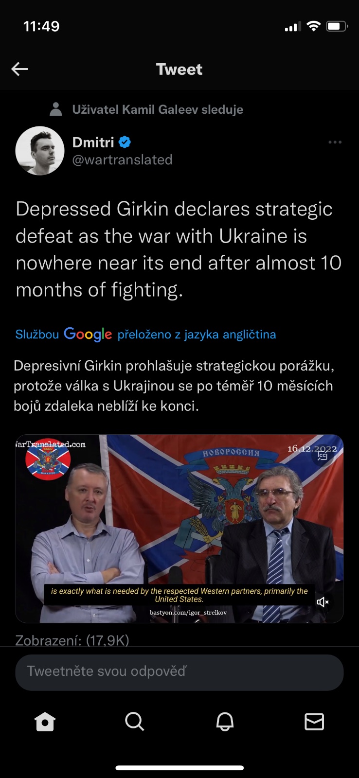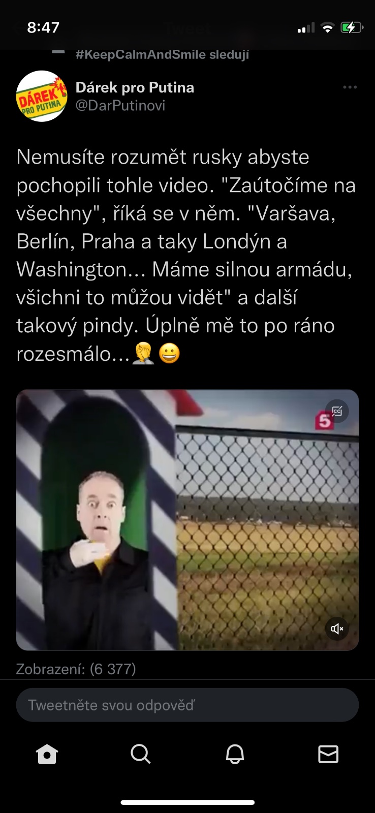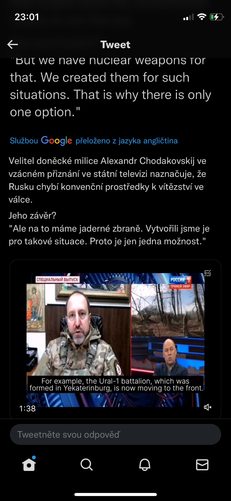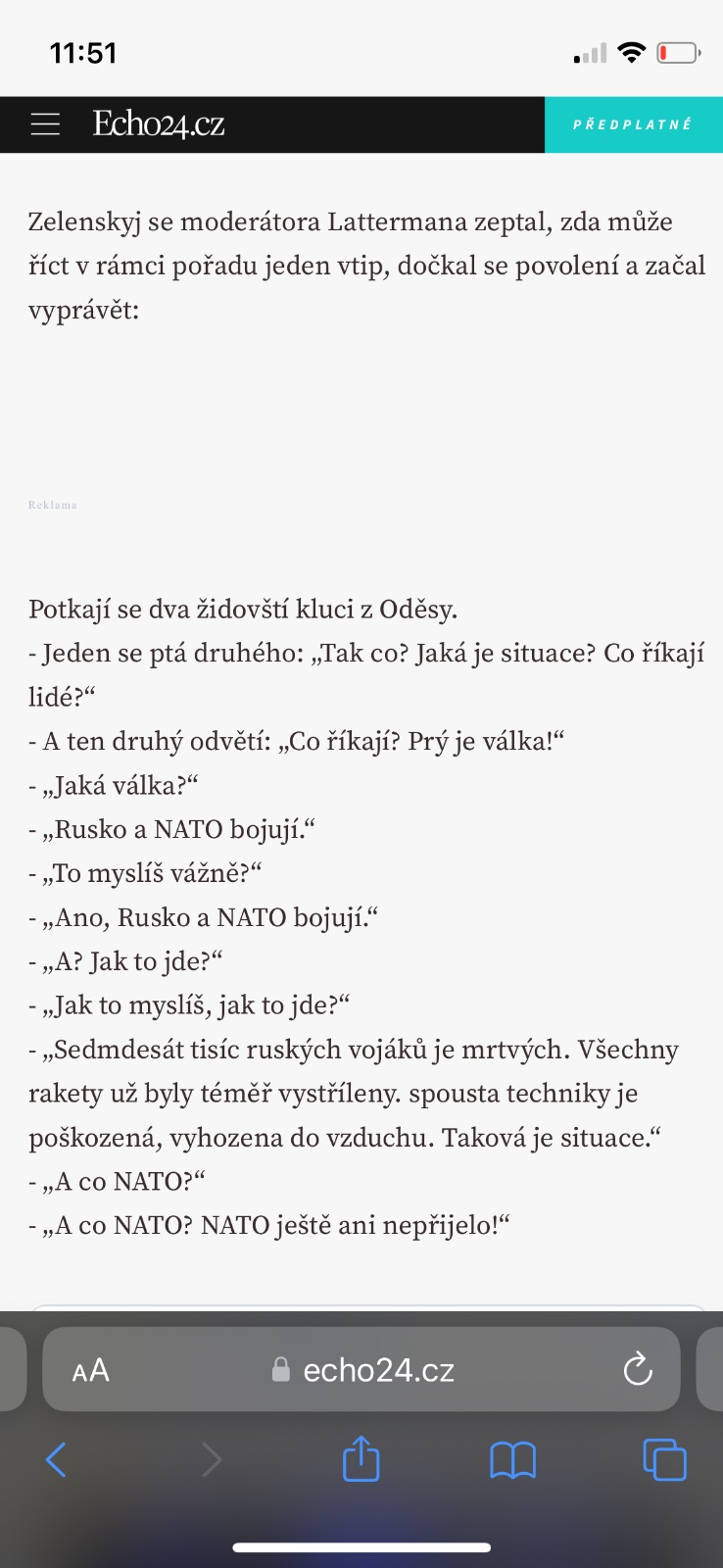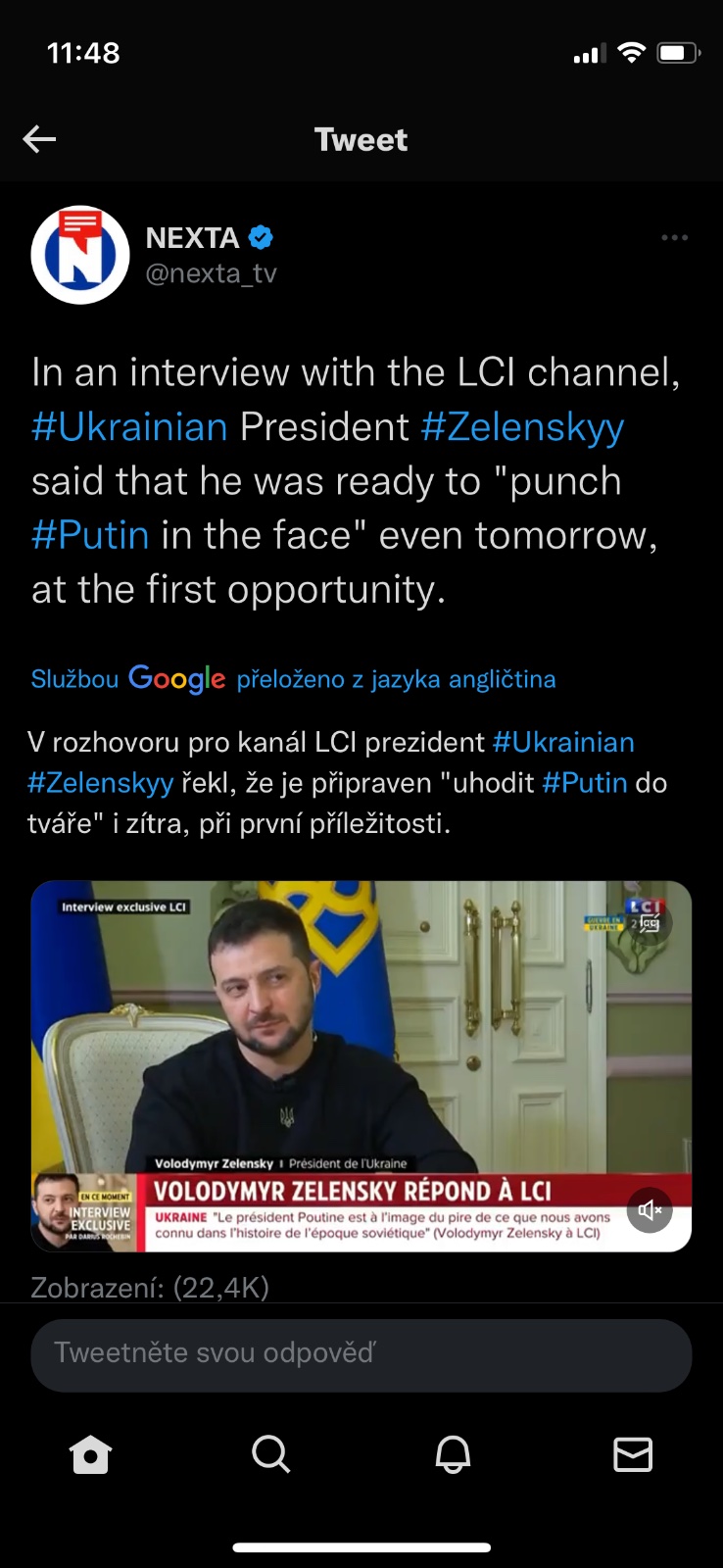 Hodně volnej překlad, jazyky nejsou moje silná stránka🙂 “ Dnes se mi zdálo o tom, že jsem byl mobilizovaný a vzali mě do nějakého přípravného kempu. V tu chvíli vzdušné síly Ukrajiny vedené Zelenskym sem vtrhly a “všechny svázali” a po všech stříleli. V ten moment ke mně Zelenskyj přišel a řekl “ Oh, viděl jsem tvoje příběhy na instagramu, Sláva Ukrajině!” Odpověděl jsem “ sláva hrdinům!” Zelenskyj mi radostně poplácal rameno a řekl “ nech (nechte?) ho jít, střílej všechny ostatní” Tak jsme s nim stáli a sledovali to všechno a řekl jsem mu “ Můžu si s tebou udělat selfie na Instagram?” Zelenky odpověděl “muzes”