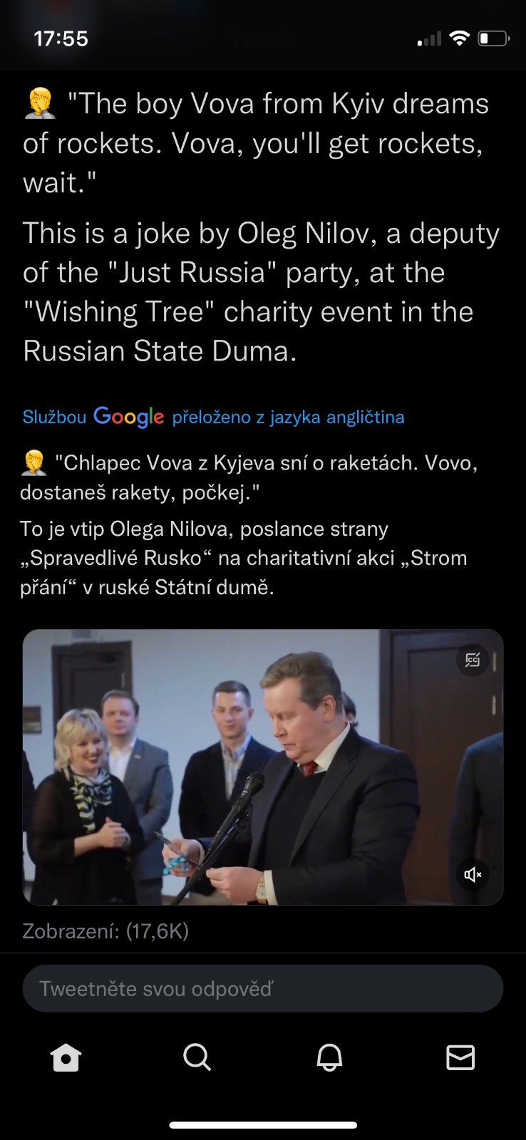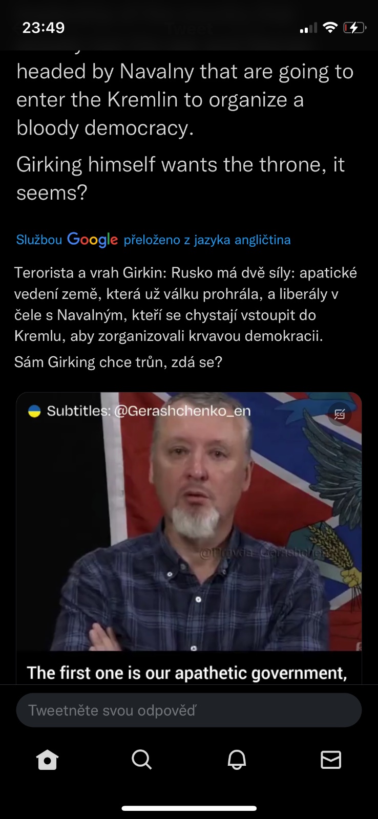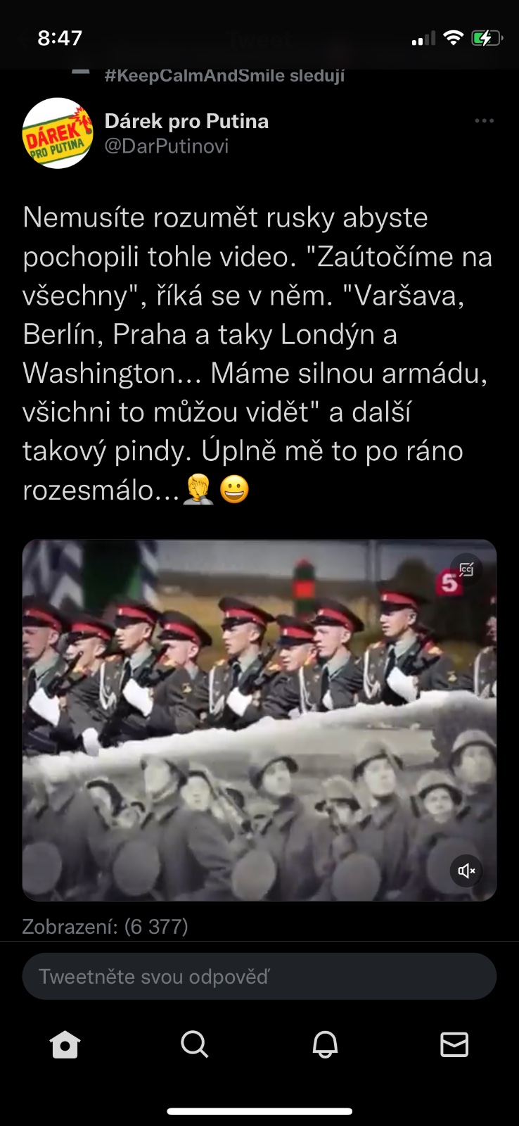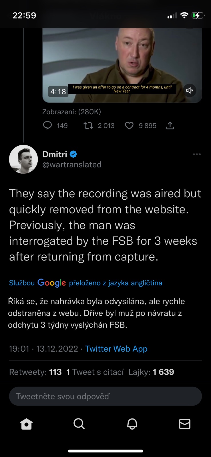 Hodně volnej překlad, jazyky nejsou moje silná stránka🙂 “ Dnes se mi zdálo o tom, že jsem byl mobilizovaný a vzali mě do nějakého přípravného kempu. V tu chvíli vzdušné síly Ukrajiny vedené Zelenskym sem vtrhly a “všechny svázali” a po všech stříleli. V ten moment ke mně Zelenskyj přišel a řekl “ Oh, viděl jsem tvoje příběhy na instagramu, Sláva Ukrajině!” Odpověděl jsem “ sláva hrdinům!” Zelenskyj mi radostně poplácal rameno a řekl “ nech (nechte?) ho jít, střílej všechny ostatní” Tak jsme s nim stáli a sledovali to všechno a řekl jsem mu “ Můžu si s tebou udělat selfie na Instagram?” Zelenky odpověděl “muzes”