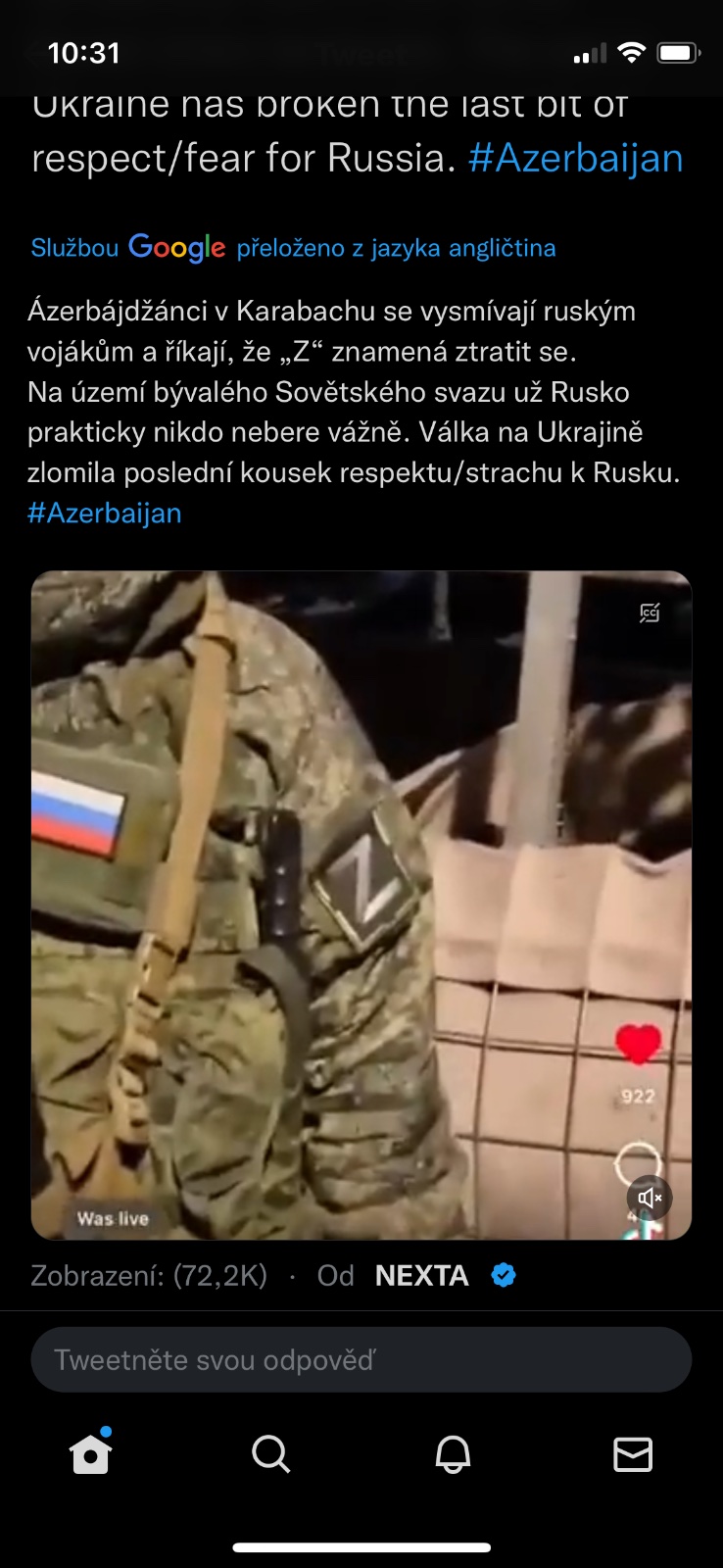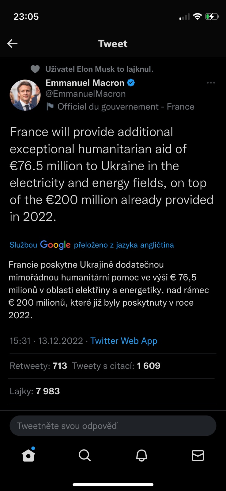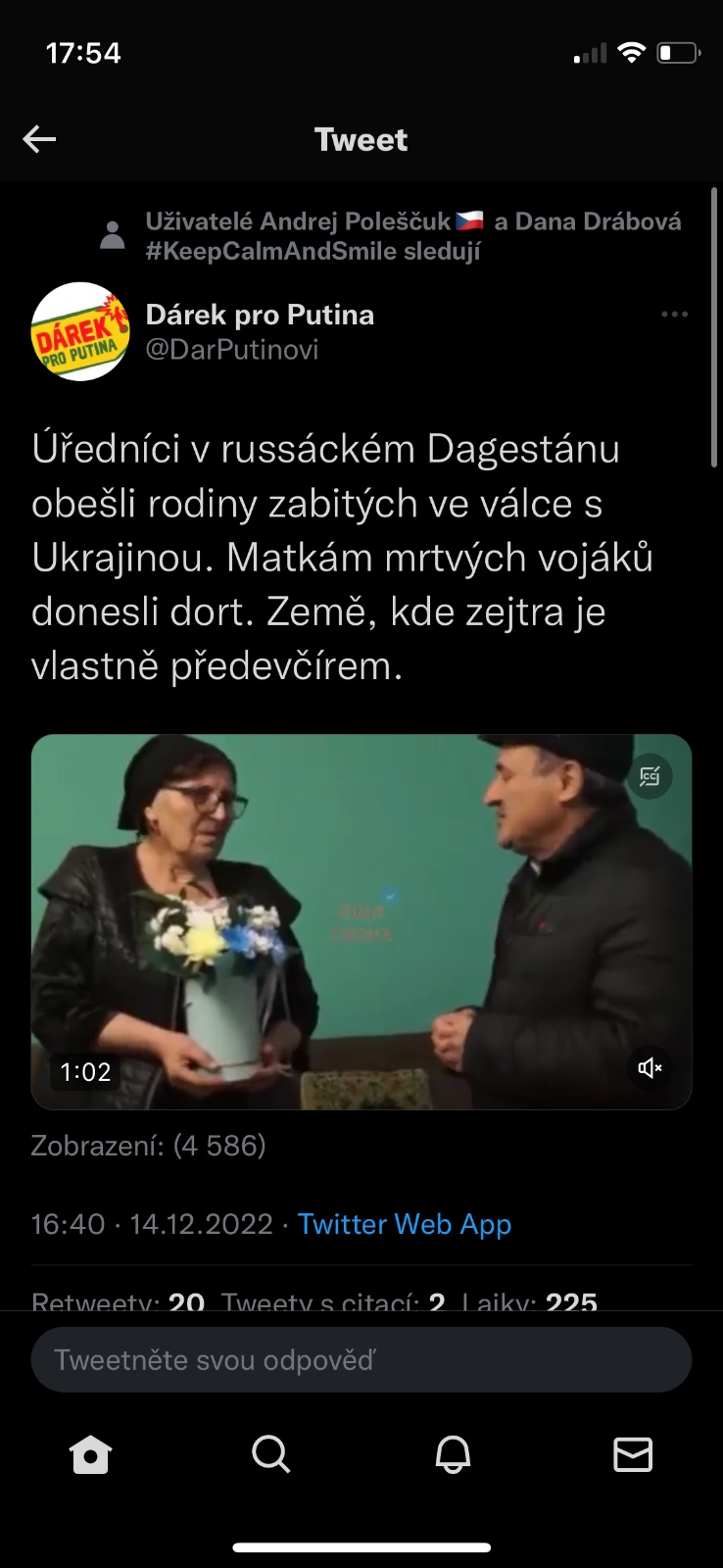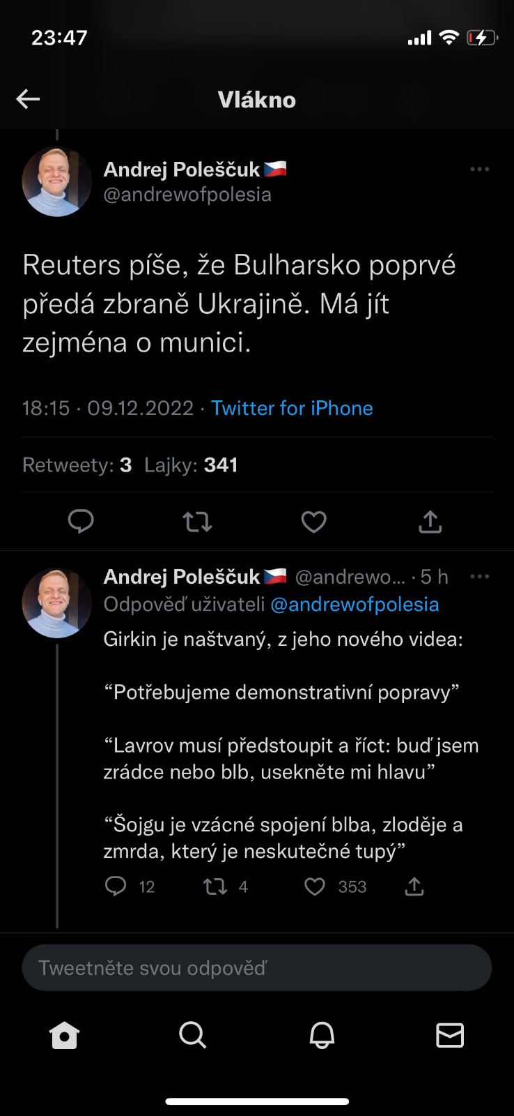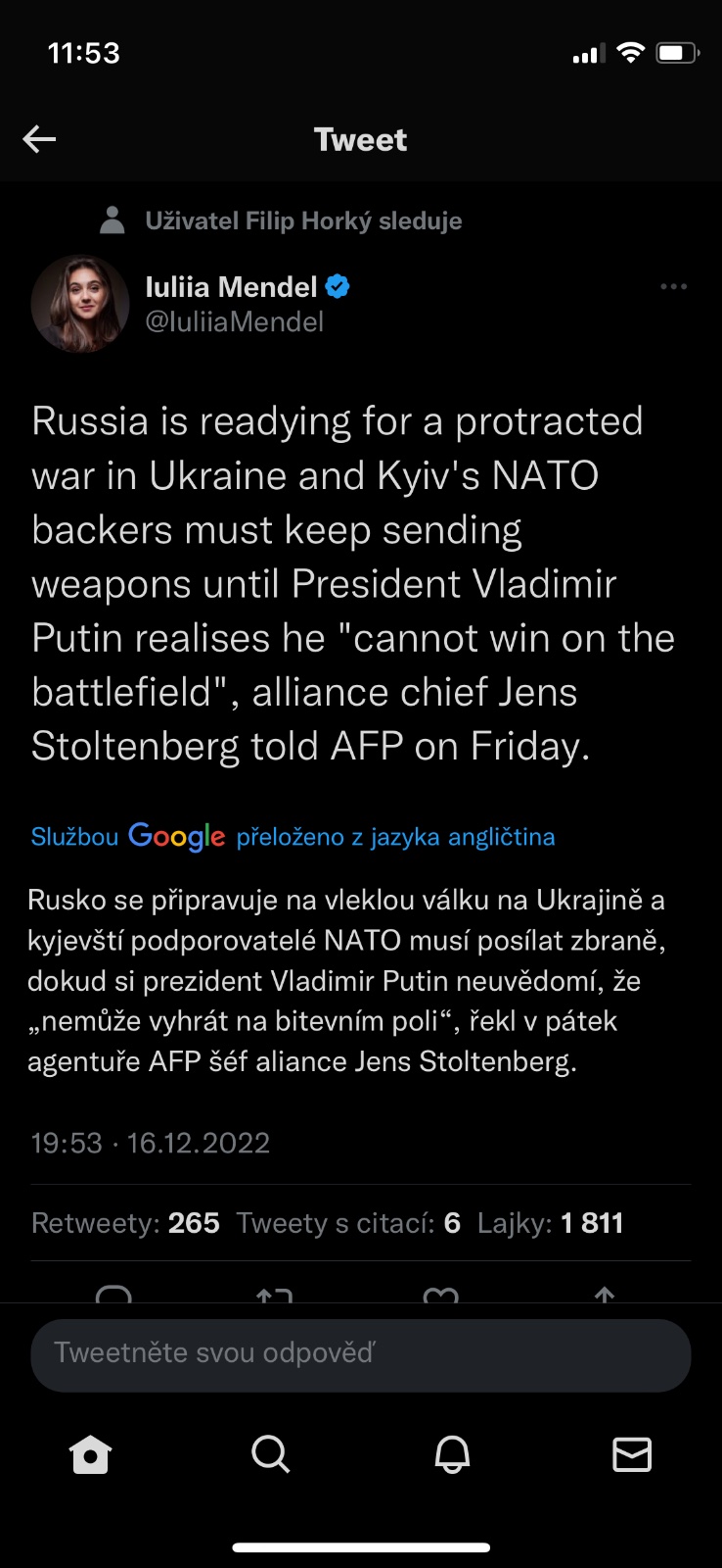 Hodně volnej překlad, jazyky nejsou moje silná stránka🙂 “ Dnes se mi zdálo o tom, že jsem byl mobilizovaný a vzali mě do nějakého přípravného kempu. V tu chvíli vzdušné síly Ukrajiny vedené Zelenskym sem vtrhly a “všechny svázali” a po všech stříleli. V ten moment ke mně Zelenskyj přišel a řekl “ Oh, viděl jsem tvoje příběhy na instagramu, Sláva Ukrajině!” Odpověděl jsem “ sláva hrdinům!” Zelenskyj mi radostně poplácal rameno a řekl “ nech (nechte?) ho jít, střílej všechny ostatní” Tak jsme s nim stáli a sledovali to všechno a řekl jsem mu “ Můžu si s tebou udělat selfie na Instagram?” Zelenky odpověděl “muzes”