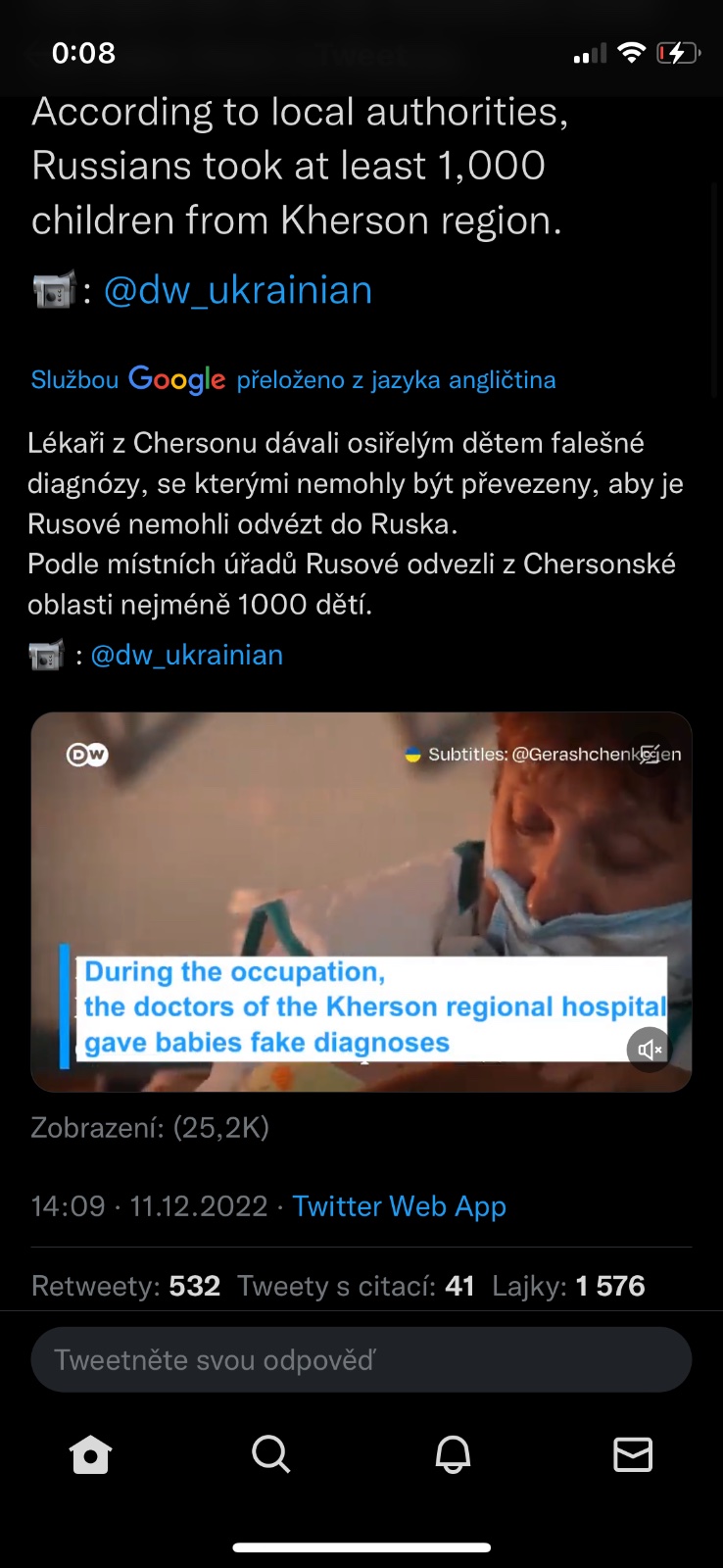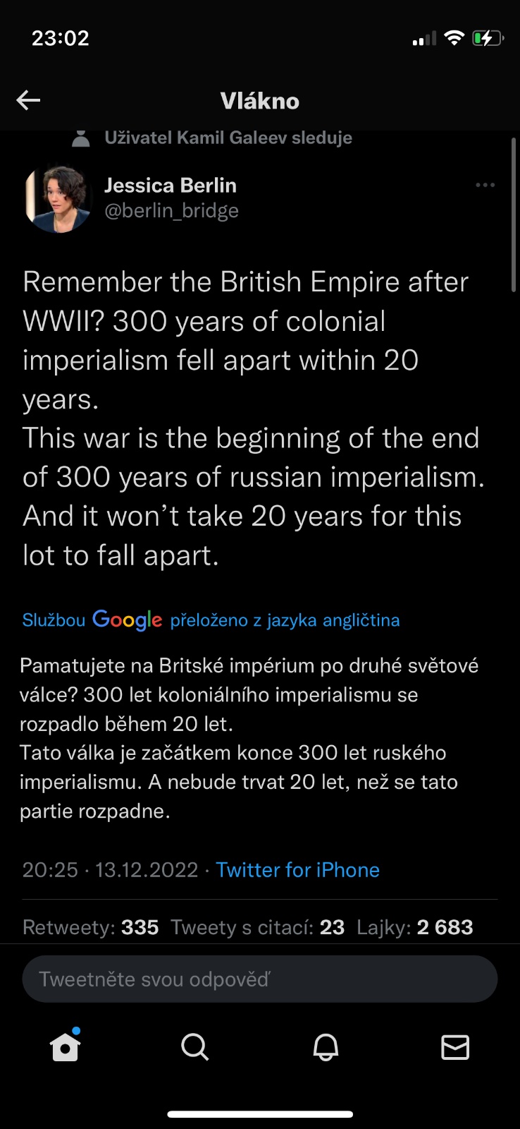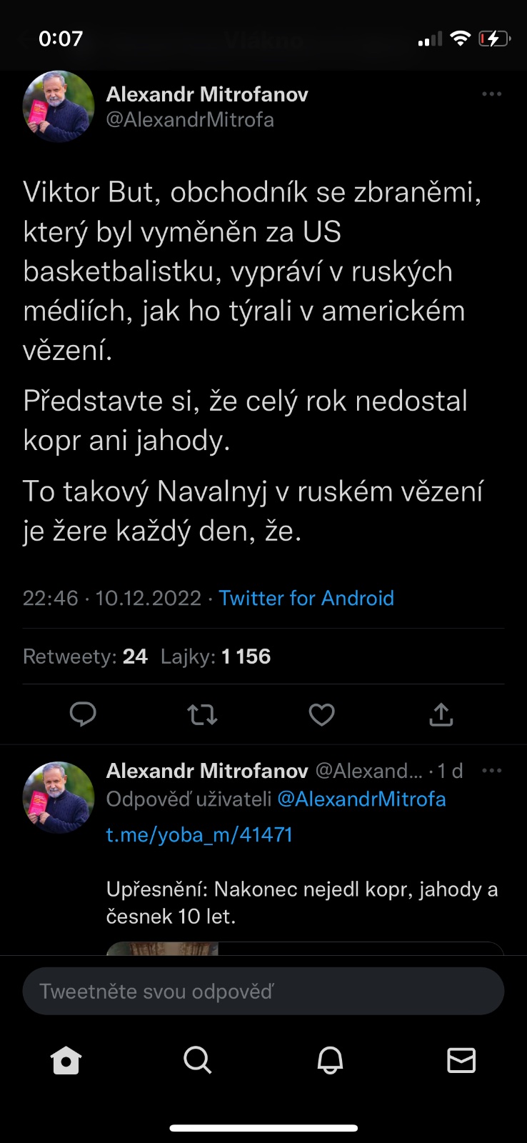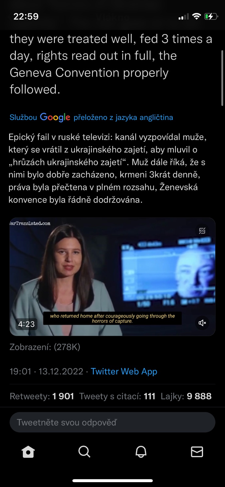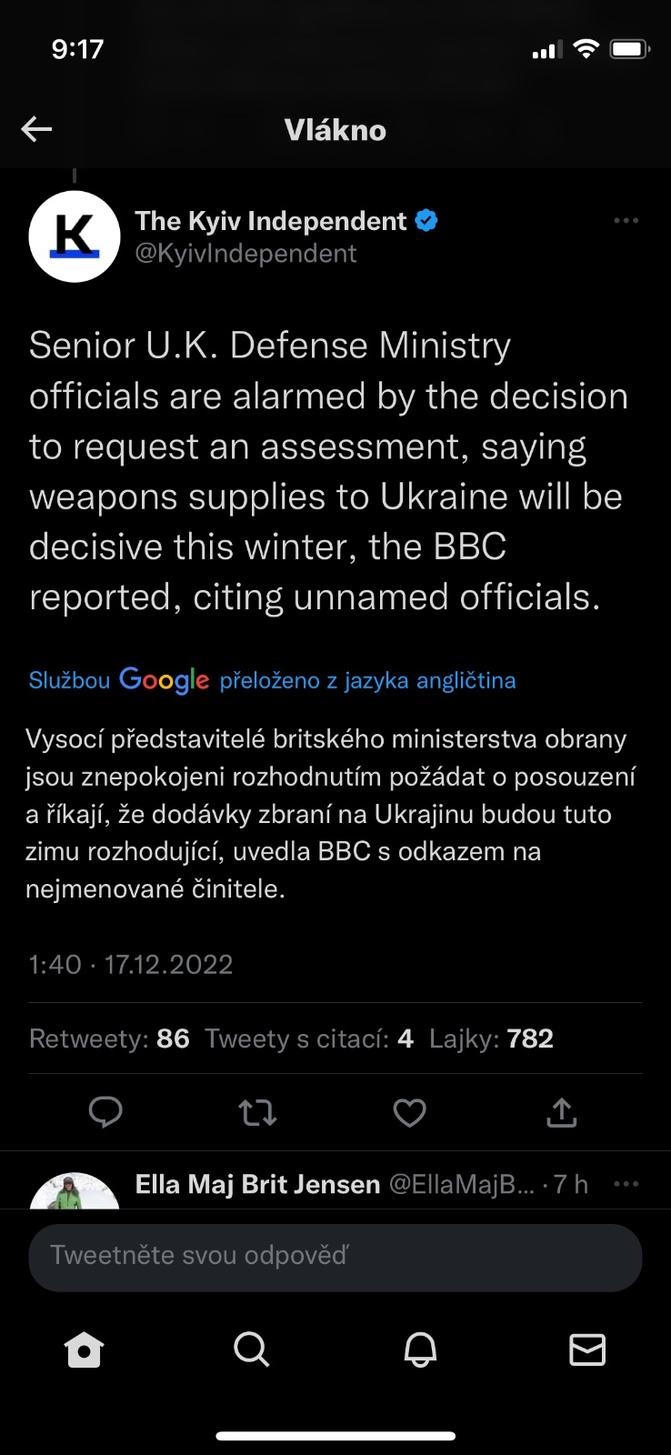 Hodně volnej překlad, jazyky nejsou moje silná stránka🙂 “ Dnes se mi zdálo o tom, že jsem byl mobilizovaný a vzali mě do nějakého přípravného kempu. V tu chvíli vzdušné síly Ukrajiny vedené Zelenskym sem vtrhly a “všechny svázali” a po všech stříleli. V ten moment ke mně Zelenskyj přišel a řekl “ Oh, viděl jsem tvoje příběhy na instagramu, Sláva Ukrajině!” Odpověděl jsem “ sláva hrdinům!” Zelenskyj mi radostně poplácal rameno a řekl “ nech (nechte?) ho jít, střílej všechny ostatní” Tak jsme s nim stáli a sledovali to všechno a řekl jsem mu “ Můžu si s tebou udělat selfie na Instagram?” Zelenky odpověděl “muzes”