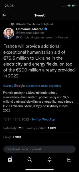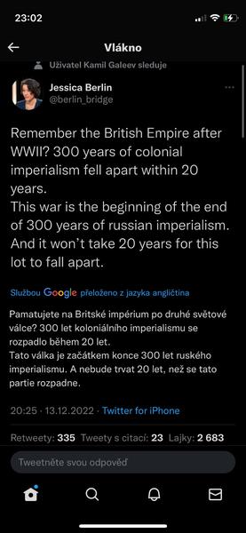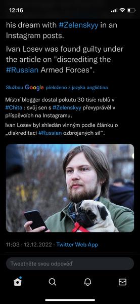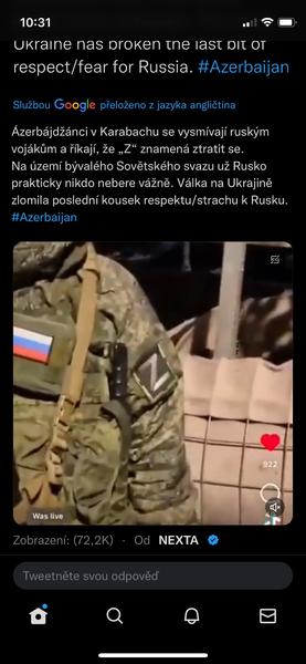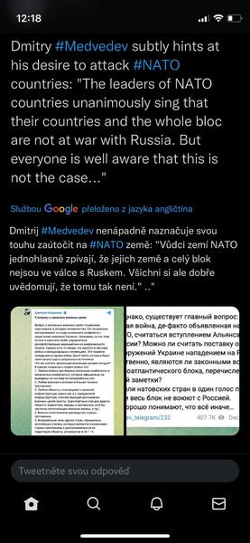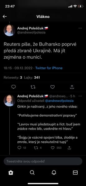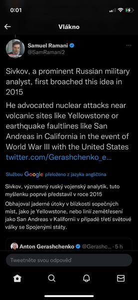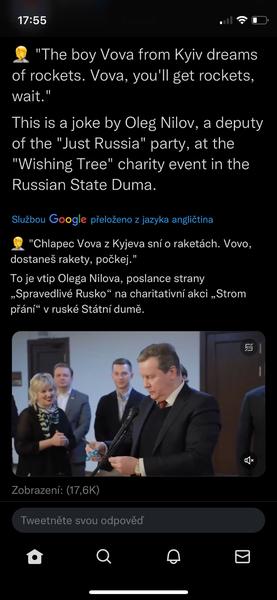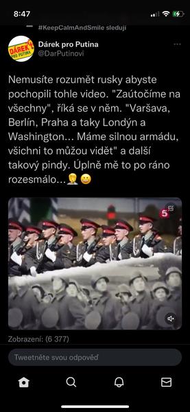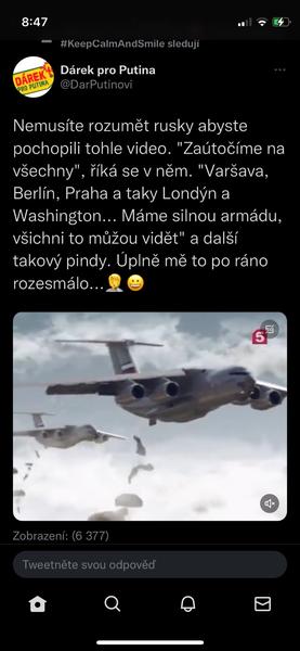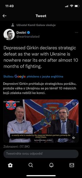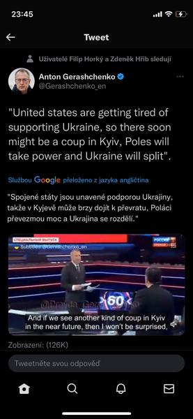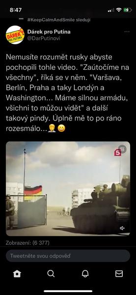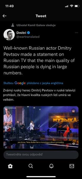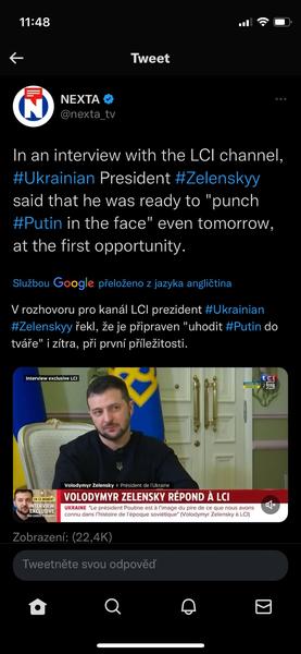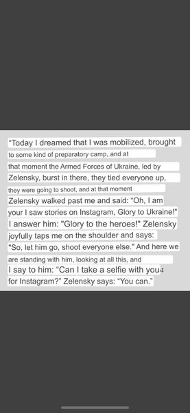 Hodně volnej překlad, jazyky nejsou moje silná stránka🙂 “ Dnes se mi zdálo o tom, že jsem byl mobilizovaný a vzali mě do nějakého přípravného kempu. V tu chvíli vzdušné síly Ukrajiny vedené Zelenskym sem vtrhly a “všechny svázali” a po všech stříleli. V ten moment ke mně Zelenskyj přišel a řekl “ Oh, viděl jsem tvoje příběhy na instagramu, Sláva Ukrajině!” Odpověděl jsem “ sláva hrdinům!” Zelenskyj mi radostně poplácal rameno a řekl “ nech (nechte?) ho jít, střílej všechny ostatní” Tak jsme s nim stáli a sledovali to všechno a řekl jsem mu “ Můžu si s tebou udělat selfie na Instagram?” Zelenky odpověděl “muzes”