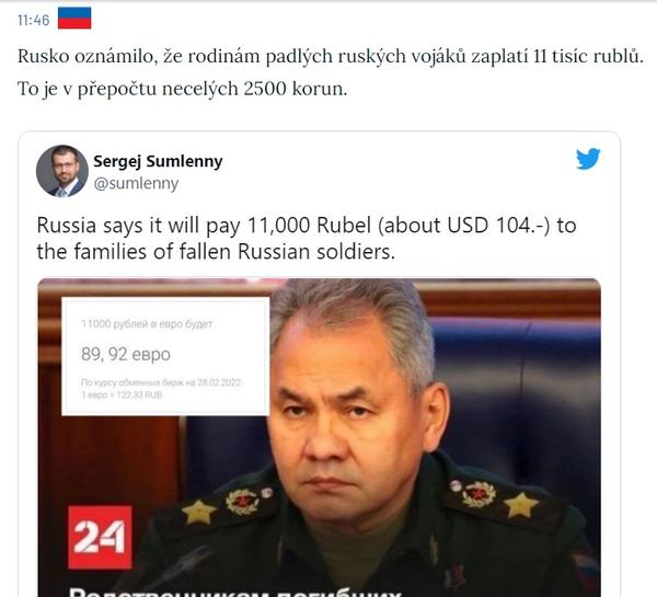@jancasirka bylo to tu par stranek zpet. Jak rubl pada tak to bude v prepoctu min a min. Neni to nic noveho, Rusku nikdy nezalezelo na zivotech jednotlivcu, maji k tomu uplne jiny pristup. Nas mnogo. Umrit za slavu ruske rise je cest… u nas nepochopitelne, u nich normalni.