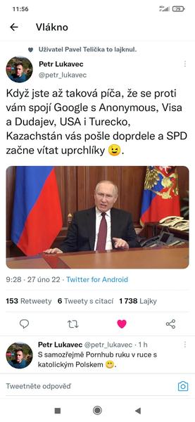 Jsem presvedcena, ze Putin se zmrazenim rezerv nepocital. Připravoval se na swift, ale ne na tohle. A fakt, ze se do tydne stane z rublu toaletak, ho musi dost zrat, protoze bude mit v zemi desitky milionu lidi bez penez.