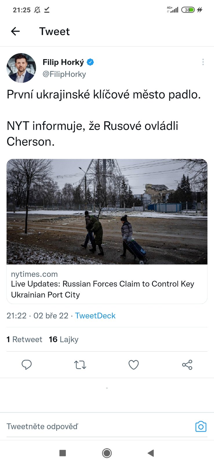 Pro obsáhlost komentářů a špatné načítání a zpětné dohledávání informací zakládám tuto diskuzi. Nově si budeme zprávy psát sem. Dle nových zpráv jsou Rusové v Charkově, kde probíhají boje v ulicích.