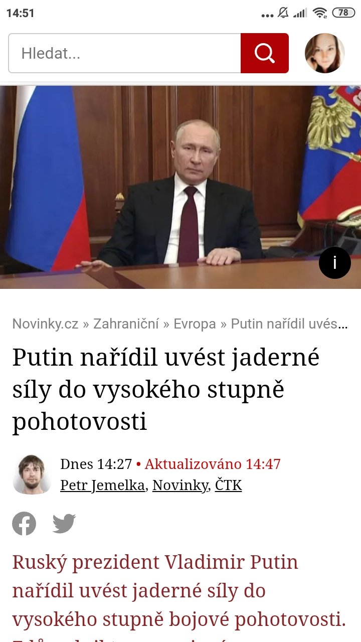 Holky, vždycky když si začnu říkat, že už je to lepší, tak přijde nějaká blbá zpráva jako teď s těma jadernejma zbraněma.. to by byl konec všeho.. 😢 Bojíte se, že k tomu dojde? Evidentně už je úplně mimo ten člověk.. 😢 Rusáci ho musí zastavit 🙏