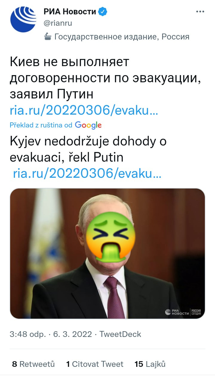 Dnes měl být zelený koridor pro evakuaci lidi z Mariupolu. Skončil stejně jako minule. Rusové stříleli na trasu, kudy se lidé měli evakuovat.