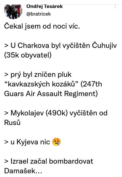Pro obsáhlost komentářů a špatné načítání a zpětné dohledávání informací zakládám tuto diskuzi. Nově si budeme zprávy psát sem. Dle nových zpráv jsou Rusové v Charkově, kde probíhají boje v ulicích.