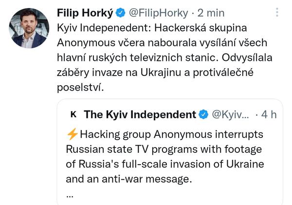 Hackerské skupině Anonymous se podařilo přerušit televizní vysílání na několika zpravodajských stanicích v Rusku. Místo něho hackeři nasadili záběry z války na Ukrajině a poslali protiválečný vzkaz. Vysílání bylo přerušeno na stanicích Russia 24, První kanál a Moskva 24. Podobně i na streamovacích platformách Wink a Ivy.ru.