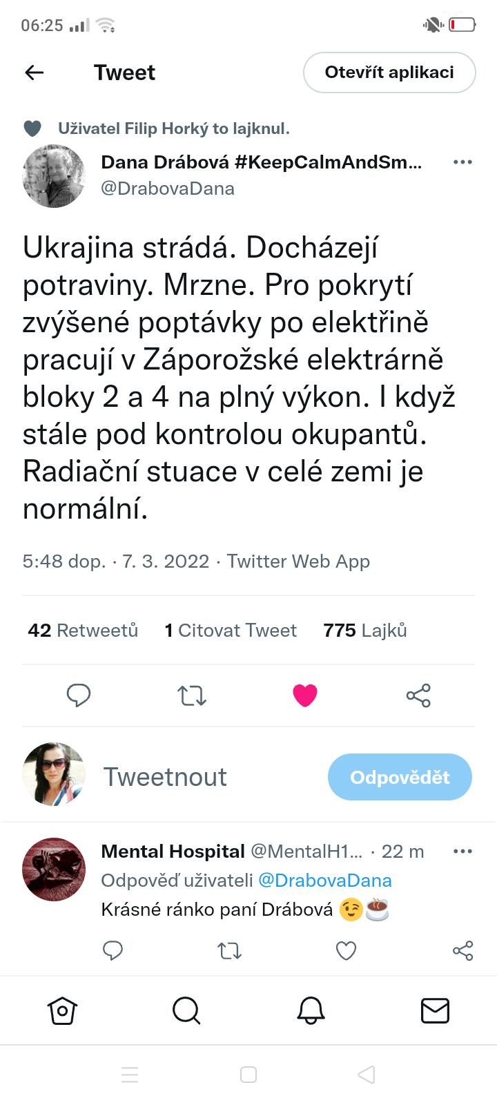 Uff dobré ráno,slzy jsem neudržela,kdo nemá instagram,tak maminka děkuje za pomoc pro syna a že mu zachránili život a dostali do bezpečí do Bratislavy, vysvětluje,že jejich dům se nachází vedle jaderné elektrárny a že nemohla se synem odejít,protože se musí starat o maminku, která je nepohyblivá.