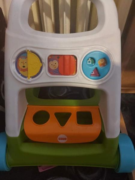 My máme takové jako stoličky na sezení, obě děti si je v určité fázi vývoje otočily nožkama nahoru a tlačily před sebou jako chodítko. Když si takhle chodítko vynalezly samy, starší pak dostala kočárek, mladší má podobné chodítko jako tu vkládala maminka na fotce, a samozřejmě se přetahují o ten dětský kočárek. Na vodění za ruku jsem háklivá, to fakt není zdravé, ale tlačit něco před sebou a současně se o to opírat, to mi přijde jako menší hrůza.