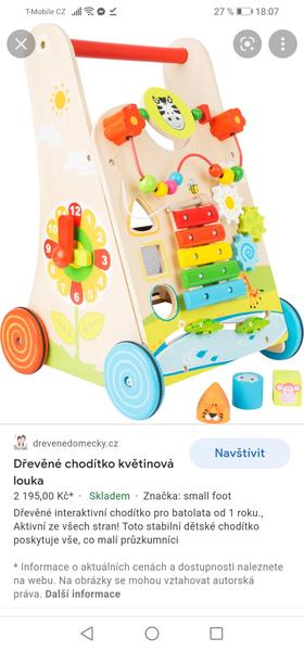 A co kdybys jí rozestavila nábytek - křesla, stůl, taburety apod...dle toho, co máte doma (venku třeba zahradní nábytek nebo něco jiného těžšího) a ona se toho může přidržovat a obcházet to, to by nefungovalo? 😉 Je to asi nejlepší varianta, co se vývoje týče a ještě zadarmo 😁