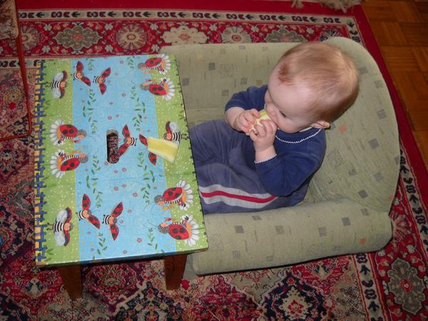 Mě je ho právě vždycky líto, jak si tu zeleninku rozmáčkne v ruce a pak se k ní nemůže dostat, ale to se asi spraví, až bude trochu šikovnější.