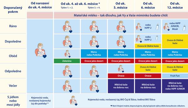 Není to tam uvedeno, ale autorem téhle tabulky bude asi Hipp, viď? Touhle bych se opravdu neřídila, je tam spousta nesmyslů (příkrmy u kojeného dítěte před ukončeným šestým měsícem, kaše dvakrát denně v druhé polovině dne apod.). Za mě jsi to dost uspěchala, šestiměsíční dítě má mít jako stabilní a nejvýznamnější složku jídelníčku pořád mléko. Trávicí trakt v šesti měsících není natolik vyspělý, aby to dokázal schroupat.