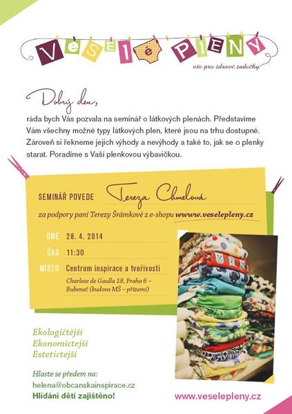 8.4 v 16.00. v MC Císařka na Praze 6 - Petřiny a 28.4 v 11.30. v MC Občanská inspirace v Dejvicích si budeme povídat o různých typech látkových plen, jejich výhodách oproti jednorázovým. Na ukázku budu mít různé typy i značky převážně českých plen. Bude čas i na event.pomoc se sestavením výbavičky. Budu se snažit vám ukázat přebalování s látkovými plenkami takové, jaké ho vnímám já - zdravější, ekologičtější, ekonomičtější, trochu pracnější než jednorázové plenky ale ne o moc...🙂 Pokud byste o tom uvažovali, dejte vědět...