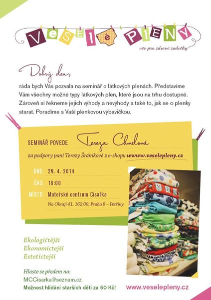 Ahoj holky, ve středu 26.3. ve 14.00 na Praze 6 plánuju uspořádat setkání a posezení s povídáním o látkových plínkách. Budu mít i různé značky a druhy na prohlédnutí, osahání... Na co myslet při sestavování výbavičky, kolik čeho koupit do začátku... Vždycky jsem chtěla podobné setkání uskutečnit, ted se snad zadaří, tak se moc těším... Pokud byste chtěly dorazit, dejte vědět...