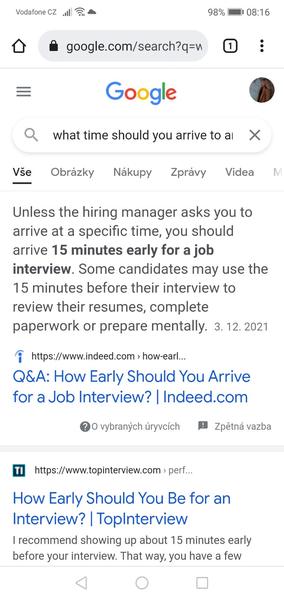 Tak u nás přijít o 15 min dříve by znamenalo, že zbývajících 13 min bude kandidát sedět sám v zasedačce a čekat, až se uvolní manažer, nebo ještě lépe bude čekat někde na chodbě, než se uvolní zasedačka. Ale věřím, že personalistka by to nějak zachránila.