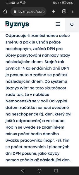 No já šla na rizikové těhotenství 6.2. a v tento den jsem ještě odpracovala celou směnu, ale od 6.2. mám lékařem již uznanou pracovní neschopnost. A účetní mi náhradu vypočítala tak, že za den 6.2. mi nenáleží náhrada mzdy za nemoc, což je logické když mám normálně odpracovanou směnu, ale prej se tento den již počítá do pracovní neschopnosti a zbývá mi tedy k proplacení 13 kalendářních (9 pracovnich dní, tj do 19.2.). Jenže podle § 192 odst. 1 ZP počíná období 14 kalendářních dnů dočasné pracovní neschopnosti pro účely poskytování náhrady mzdy následujícím kalendářním dnem, vznikla-li dočasná pracovní neschopnost v den, v němž má zaměstnanec směnu již odpracovanou. Tudíž podle tohoto zákona se domnívám že by mi mělo těch 14 dní běžet až od 7.2. do 20.2. Tak nevím..