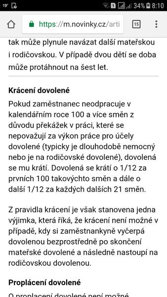 Ahoj holky, mam takovou otazku. Dnes jsem byla jako ze posledni den v praci. V pondeli jdu jeste k lekari takze budu mit paragraf a od utery si vybiram dovolenou. Ja si vypocitala ze mam narok na 10,5 dnu dovolene. Tak jsem si myslela ze ty vyberu a pak pujdu na neschopenku a pak na materskou. Ale dnes mi vedouci rekla ze mi davaji celych 25 dnu dovolene. Ze to zjistovala a mam na ne narok. Nevite jak to je? Moc tomu neverim. Prece se to pocita podle odpracovanych mesicu. Diky za radu
