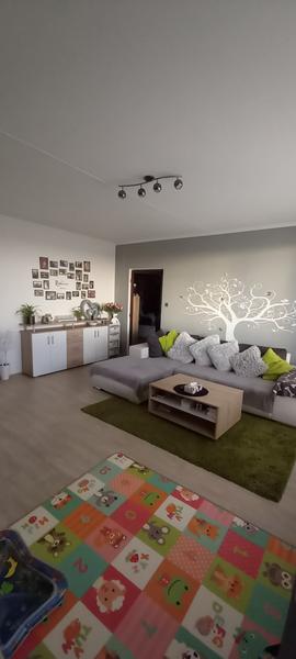 Dvě zdi jsou vymalované tmavší šedivou a třetí zůstala bílá (čtvrtá jakoby není, je tam balkonová sestava), nábytek je dub sonoma s bílou, pohovka je šedivá s bílou koženkou a podlaha je lino v dekoru světlejšího dřeva. Do teď jsem měla doplňky v limetkové (závěsy, koberec, polštářky a pár květináčů), ale jak píšu výše, už se v tom necítím dobře.