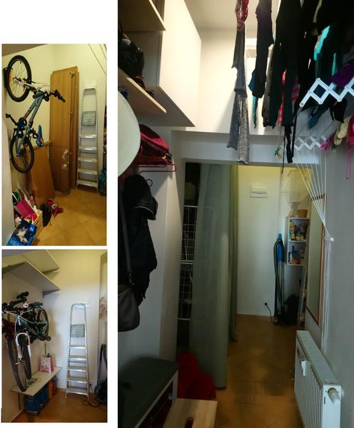 Vysloveně bordel (typu dětská postýlky “co kdyby”) máme ve sklepní kóji. Máme byt 63m2 a jsme aktivní, takže máme plno krámů. Při rekonstrukci jsme do chodby vmísili malou komoru, v ní jsou police až do stropu, tam máme kempovací věci včetně stanu, všechny batohy, krosny, helmy, mlíka, toaleťák, cyklosedačku, sušák, věšák. A pak velkou vestavěnou skříň až do stropu v chodbě, ve vrchních fochách jsou sezónní věci. Něco v úložném šupleti v gauči.