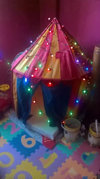 Máme taky 2+1, synův osobní prostor řešíme stanem (fotka je zimní, na místě stanu bývá stromeček a tohle jsem mu vyrobila, když se stromek likvidoval a on chtěl pořád světýlka).