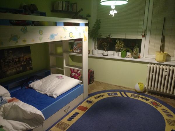 @ajkaskajka Mame dve steny svetlo zelene a dve tmavšie. Kombinácia s bielou. Nabytok je bielosivy -poschodova postel s modrou a nabytok polovica s modrou druhá s ružovou.