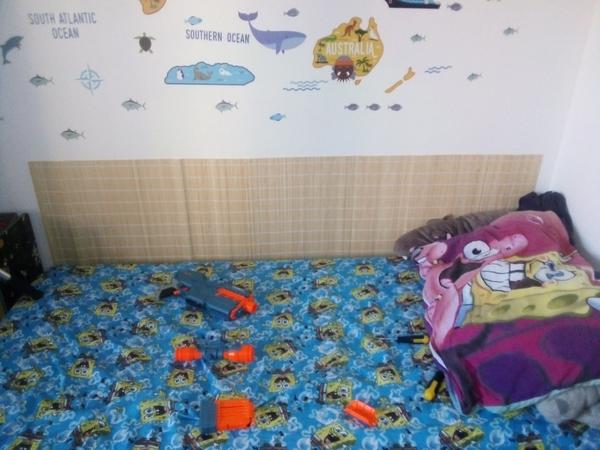 My máme postel že je s bočnici kolem dokola, takže na té straně u stěny má přivázaný mantinel z postýlky 😀 vybírala jsem schválně postel, aby to nebylo holé a nebyl přímo na holé studené zdi.