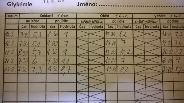 Já jdu zítra do poradny tak jsem na to zvědavá protože když jsem byla na testu tak jsem měla lačná 5,2 po hodině 10 a dvě hodiny 8 ale když jsem si ted měřila doma tak mám ráno na lačno tak 3,6 a po jídle mám třeba i 3,8 nebo 4 nikdy jsem neměla doma víc jak 6 po jídle tak jsem na to zítra docela zvědavá :/