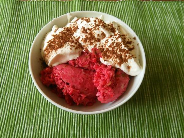 Nedávno jste se tu bavily o zmrzlině, dnes jsem vyráběla malinovo banánovou (100g malin, 50g banán - přes noc zmražené a na svačinu rozmixované s kapkou vanilkového extraktu), já si teda ještě udělala domácí šlehačku ze smetany🙂 Je to strašná dobrota, mnohem lepší, než kupované přeslazené zmrzliny! A pohodlně splňuje 30g sacharidů, co mám na sváču🙂