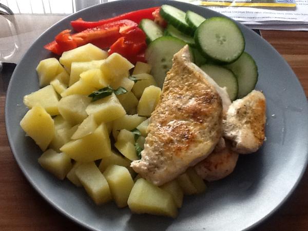 Tak dnešní oběd.Pochybuji, že to sním a chybí mi 20g sacharidů jestli to teda dobře počítám.Nepočítam v tom maso a okurku , ty v tabulce nejsou napsané