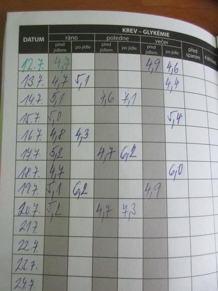 Krasne rano preju 🙂 Tak vcera po kontrole jsem vyfasovala inzulin (Lily Basal 4 jednotky vecer) ☹ Rozhodujici byla jedna pitoma hodnota nalacno (v pondeli rano) ktera se mi zahadne od nedelniho vecerniho mereni nehnula ani o fn - 5.61. Tak uz mam za sebou prvni pichnuti. Ja to tedy nezvladam, musel to obstarat muj drahy, ja mam v sobe fakt silenej blok si sama vrazit jehlu do nohy :D Hodinu jsem se premlouvala, abych pak zjistila ze to fakt neboli - aspon neco. Ale - rikala jsem si ze super ze konecne uvidim nejake pekne hodnoty rano nalacno a co bylo dneska? 5.28 coz je hranice. Tak snad se to behem tech tri dnu srovna, a bude to nizsi, jak mi slibovali. Jinak mam zvednout na 5 jednotek. Zitra jdu na gyndu tak jeste uvidim co mi tam povi on. No a na diabetologii musim kazdy tyden ted. Ach jo ☹ Tak doufam ze se mate lip 🙂