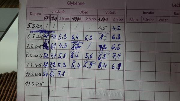 @erlif to jo, taky me to stresuje :(, jsem z toho smutna pak...ja ted od ctvrtka zapisuju denne, dnes mi prisly nahradni prouzky, ale zitra koncim a budu uz merit min, ona mi to i rikala myslim, ale nevim uz kolikrat...myslim rikala 3dny v tydnu...no ukazu ji tohle a uvidime. Ja to mam zatim takto, co myslis? Jinak idealni hodnoty jsou okolo 6 po jidle teda jo? To ja mivam cca po veceri, ale pak to zas roste...divny no...