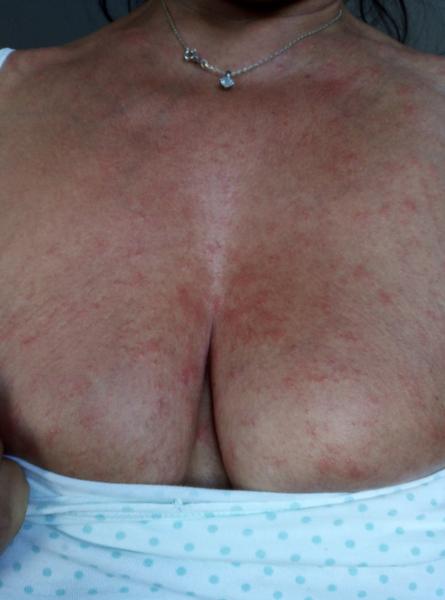 Zajdi na kožní, já to měla údajně jako reakci na infekci v krku, celá jsem se osypala. Myslím, že na kožním kolikrát taky hádají. Píchla mi kalciovku a předepsala antihistaminika. Do týdne to zmizelo.